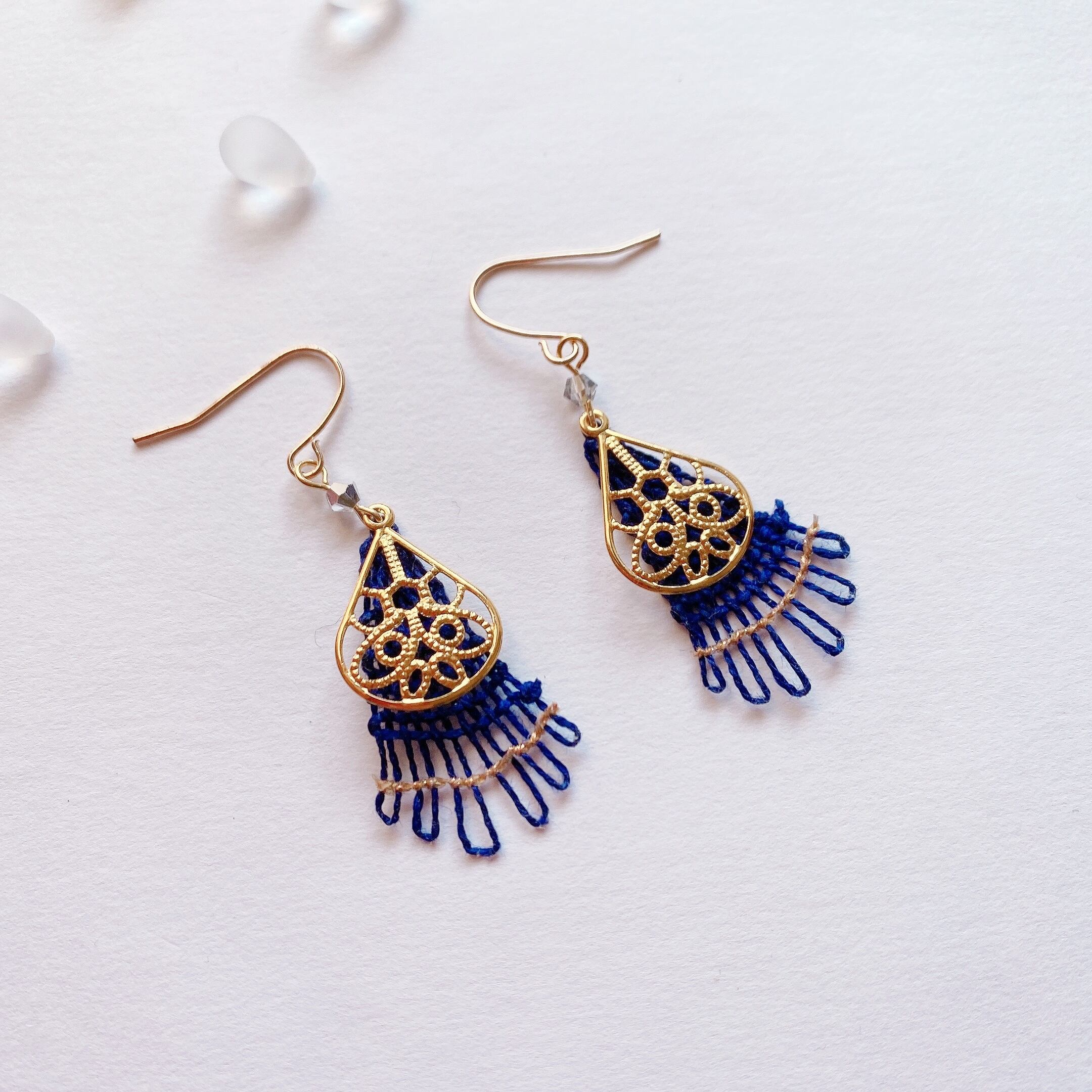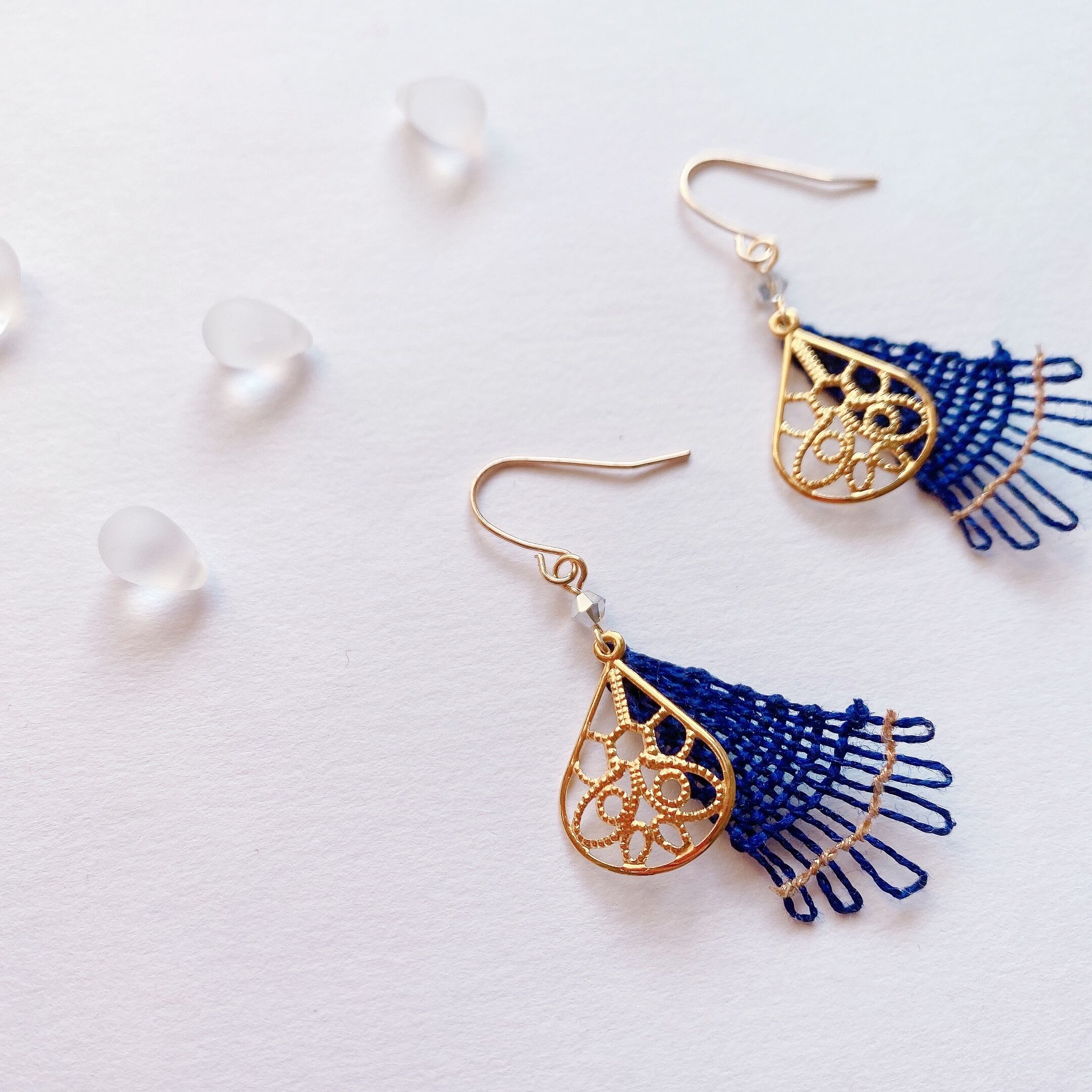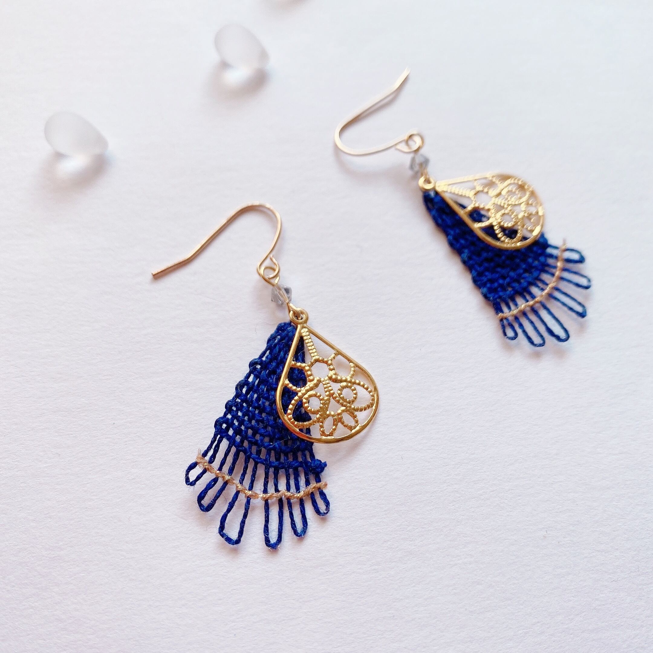 [材料]     ブルー糸・ ゴールド糸・ダイヤカットビーズ・ゴールドモチーフ・ピアス金具