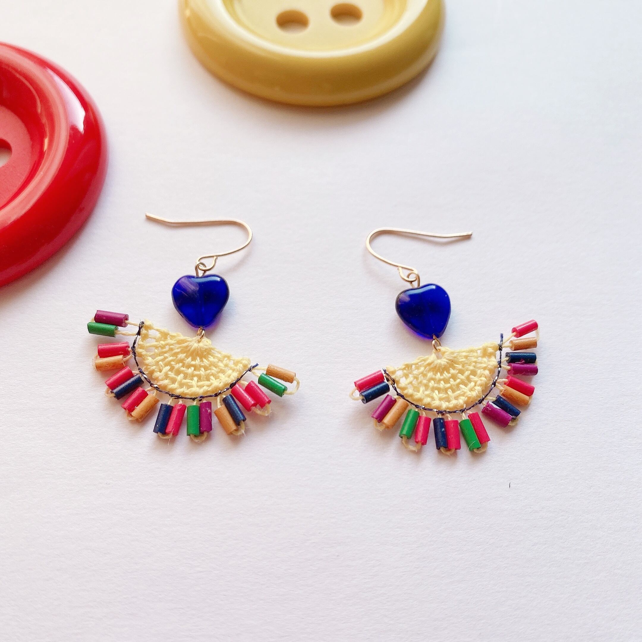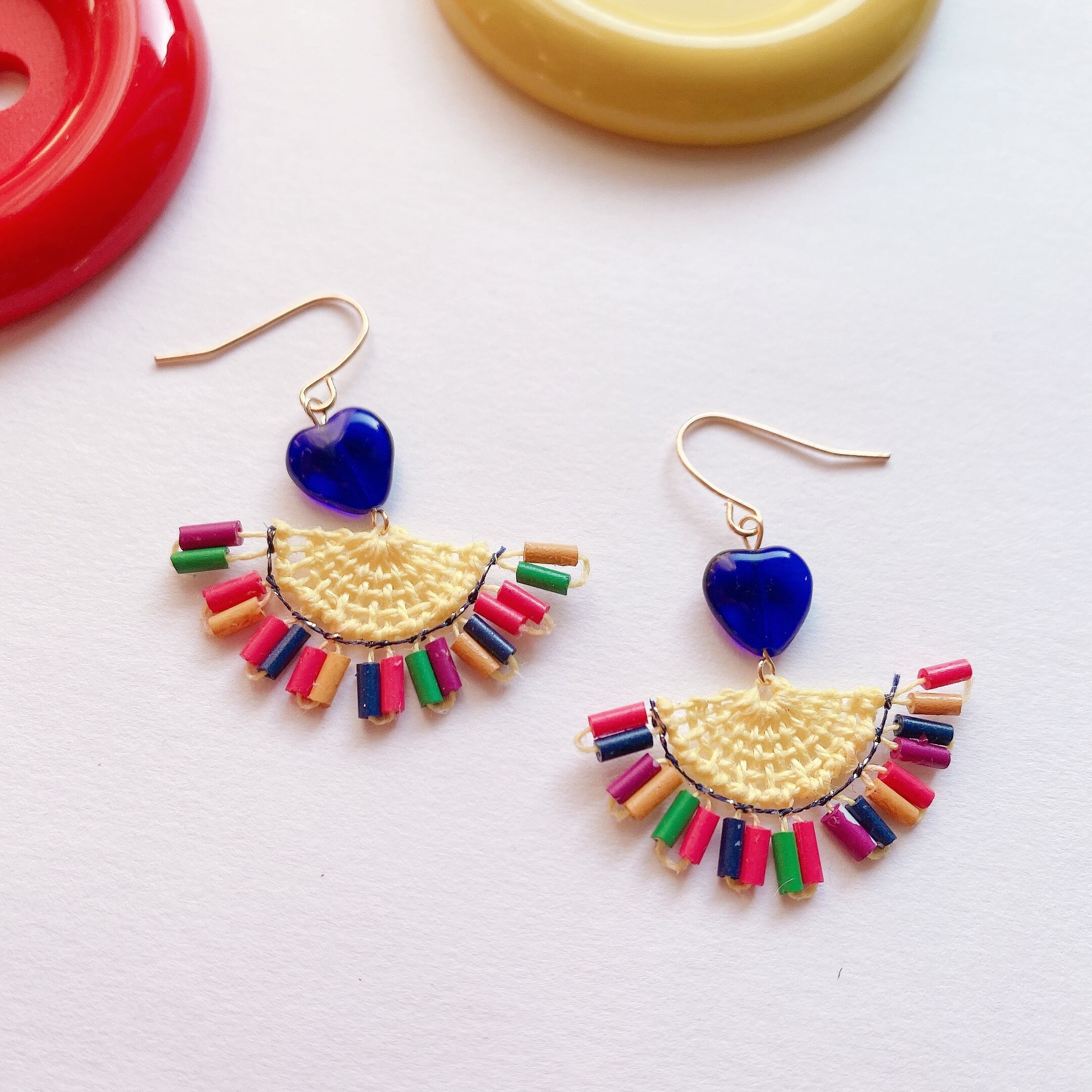 パキッとしたカラーの竹の形ビーズととても濃ゆいブルーのハートを合わせました。