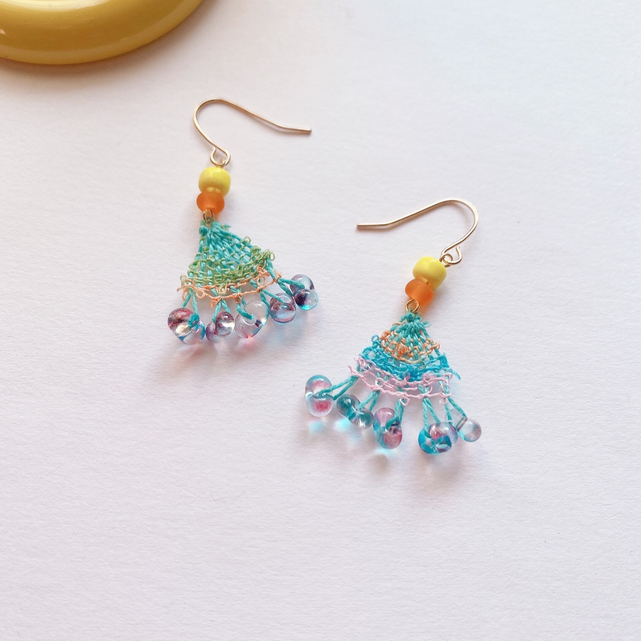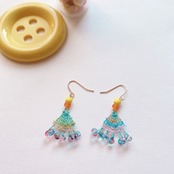 [材料]     薄水色糸・ 手染め糸・ガラスビーズ・ピアス金具