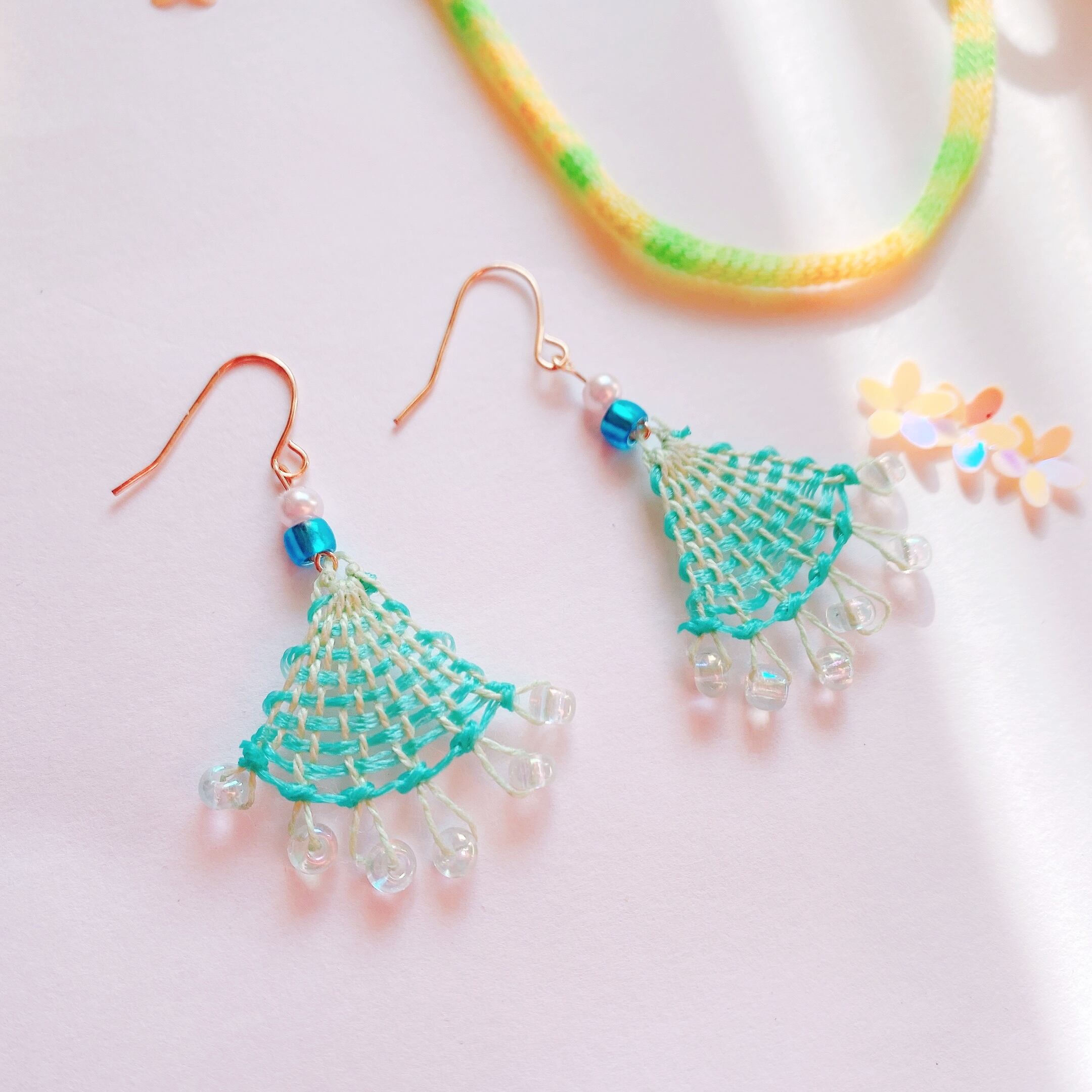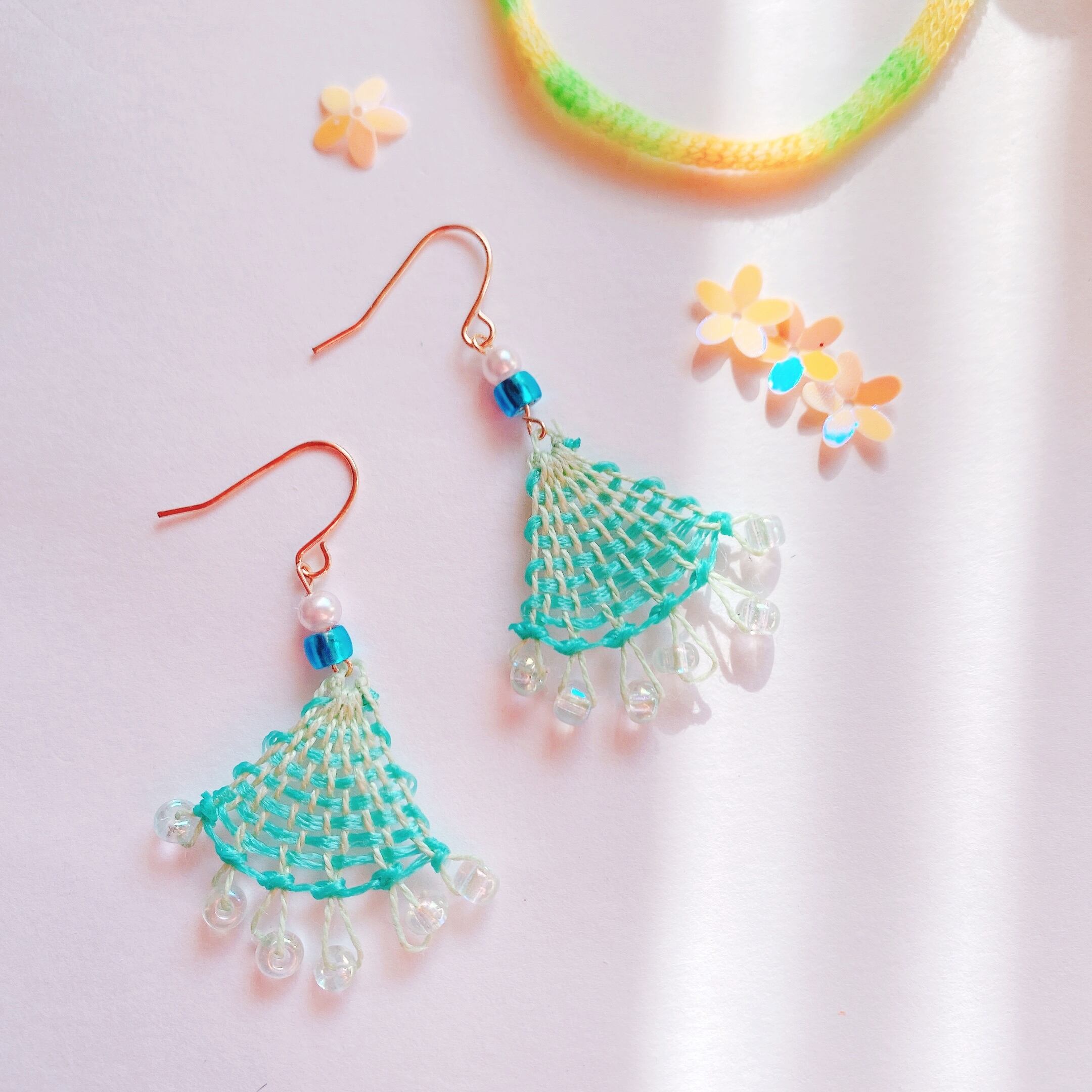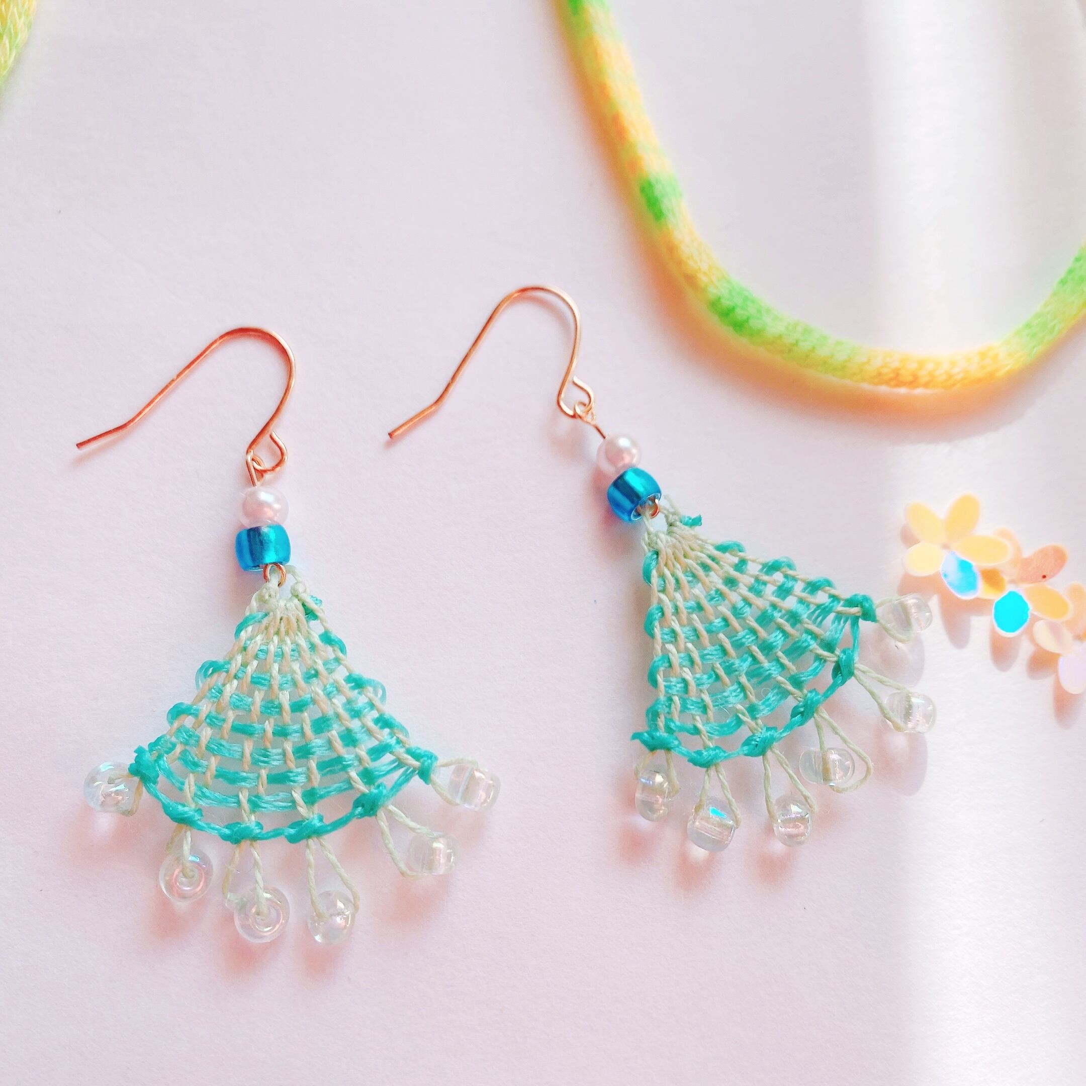 [材料]     薄い水色糸・サテンパール糸・アクリルビーズ・ピアス金具