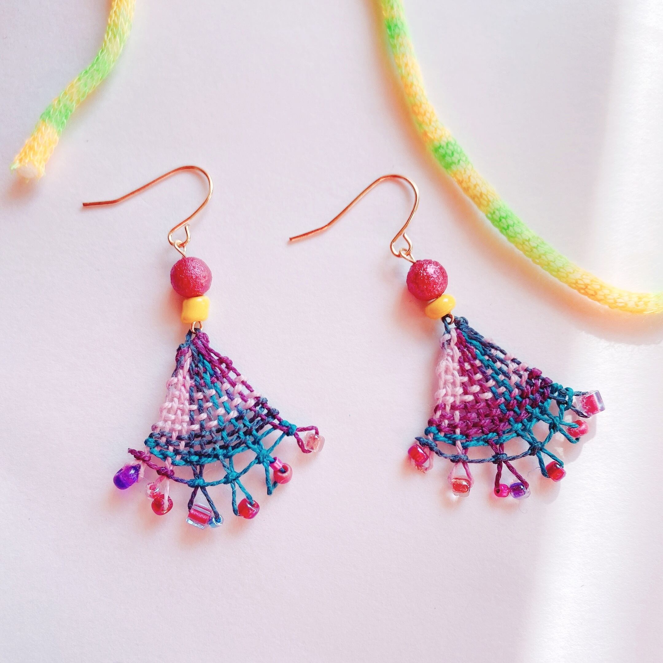 [材料]     紫色綿糸・グラデーション糸・ガラスビーズ・ピアス金具