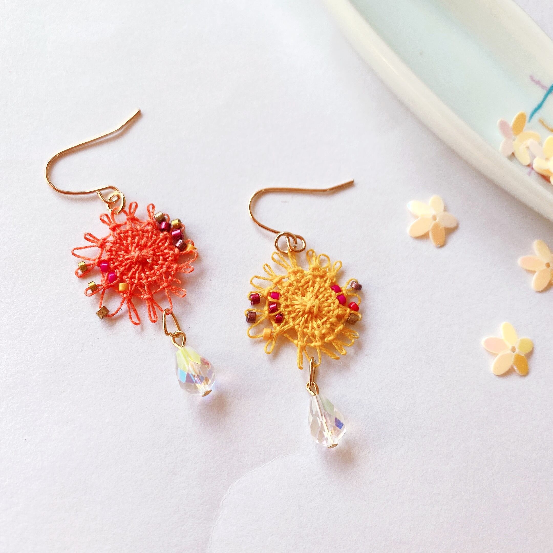[材料]     オレンジ色・黄色糸・ガラスビーズ・クリスタルビーズ・ピアス金具