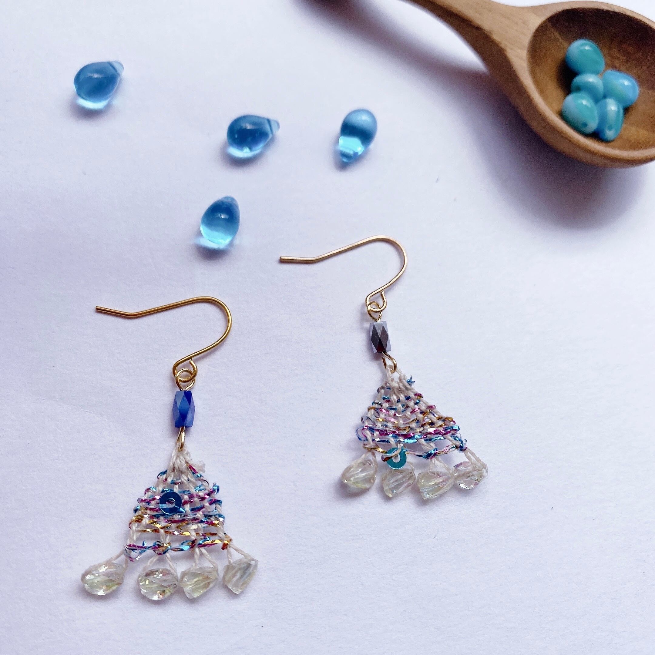 [材料]      ホワイト色糸・スパンコール入りグラデーション糸・ガラスビーズ・ピアス金具