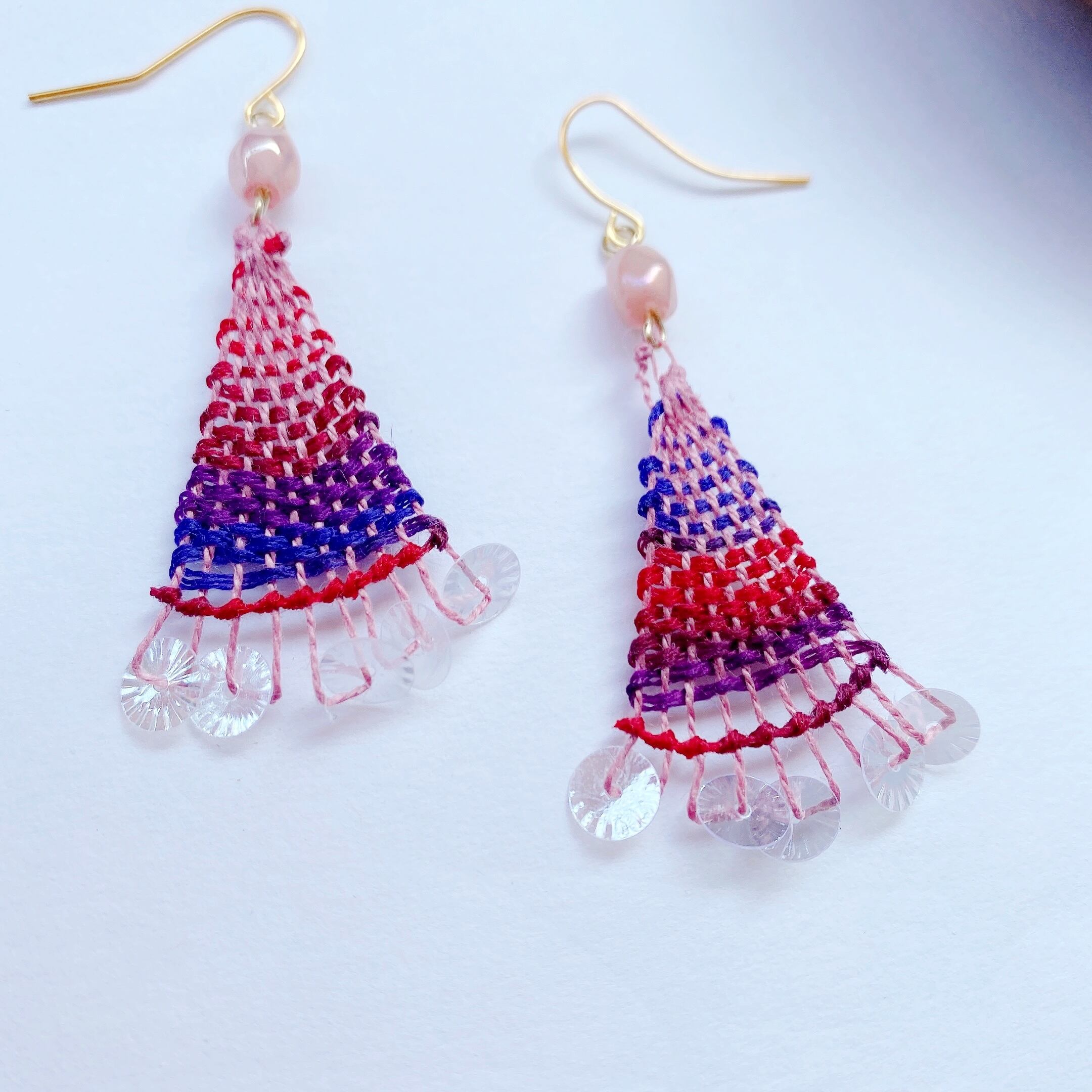 [材料]     薄いピンク糸・グラデーション糸・ガラスビーズ・スパンコールビーズ・ピアス金具