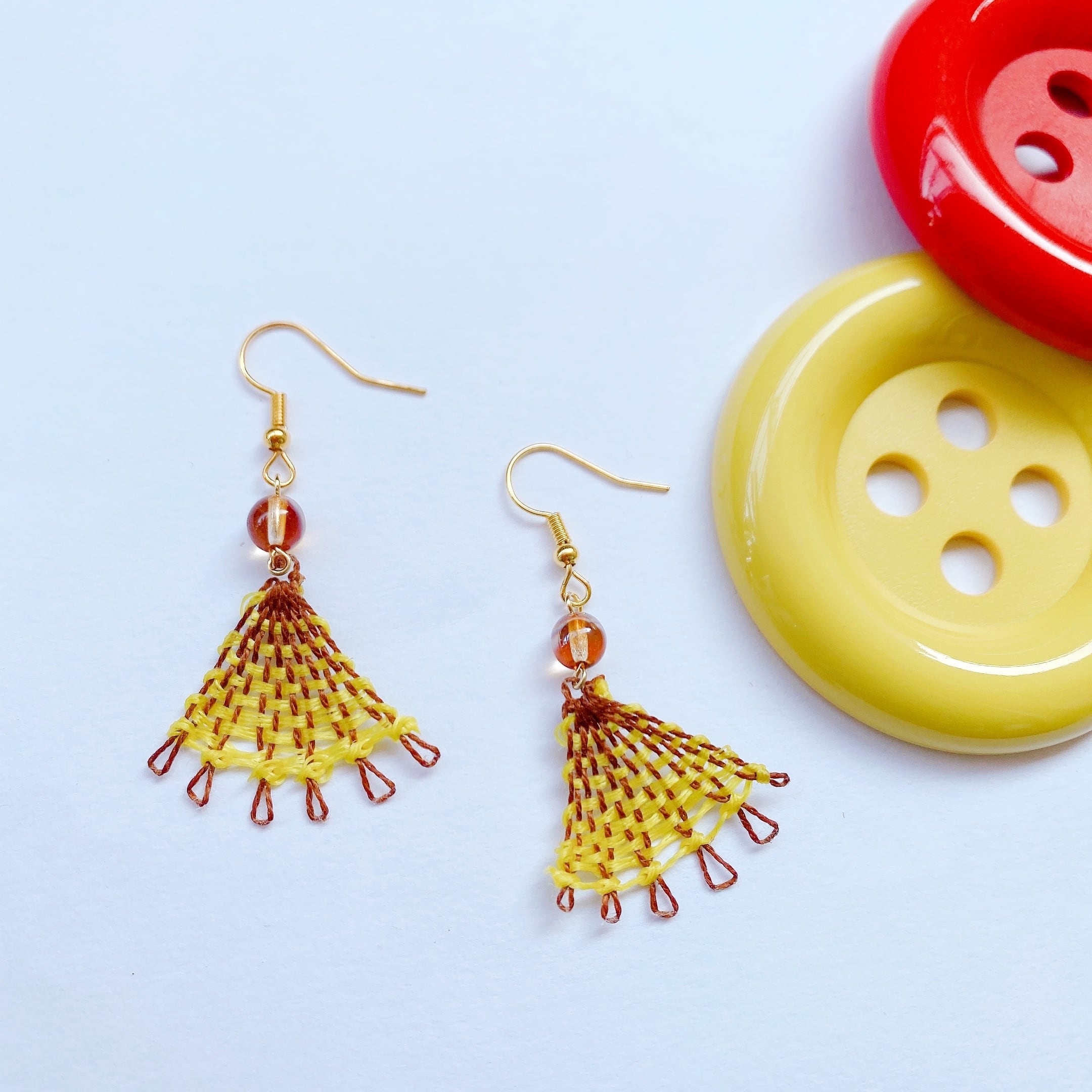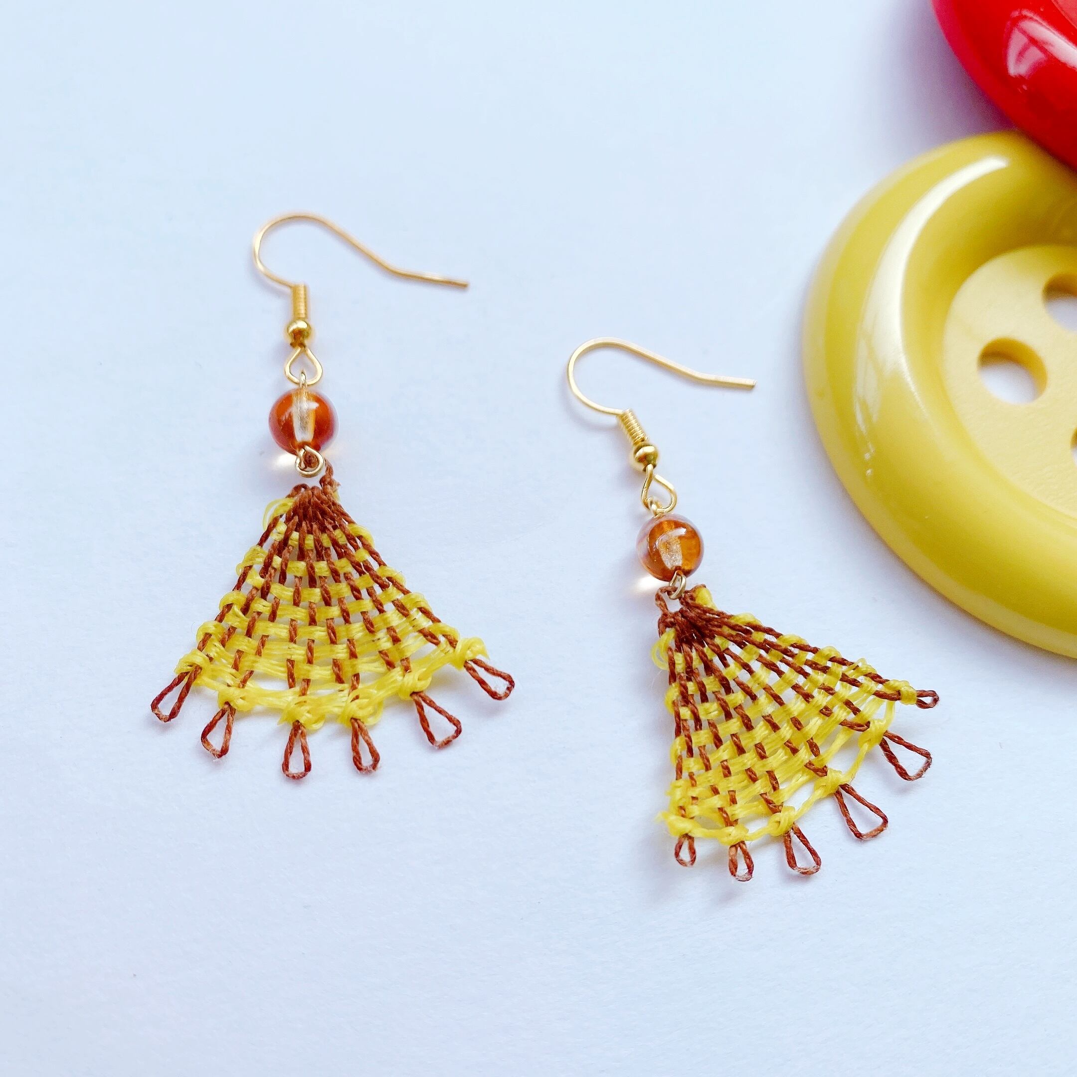 [材料]     ブラウン糸・サテン黄色糸・ガラスビーズ・ピアス金具