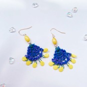 濃ゆいブルーカラーのモコモコ糸とぱきっとした黄色のイタリアンビーズを合わせました。