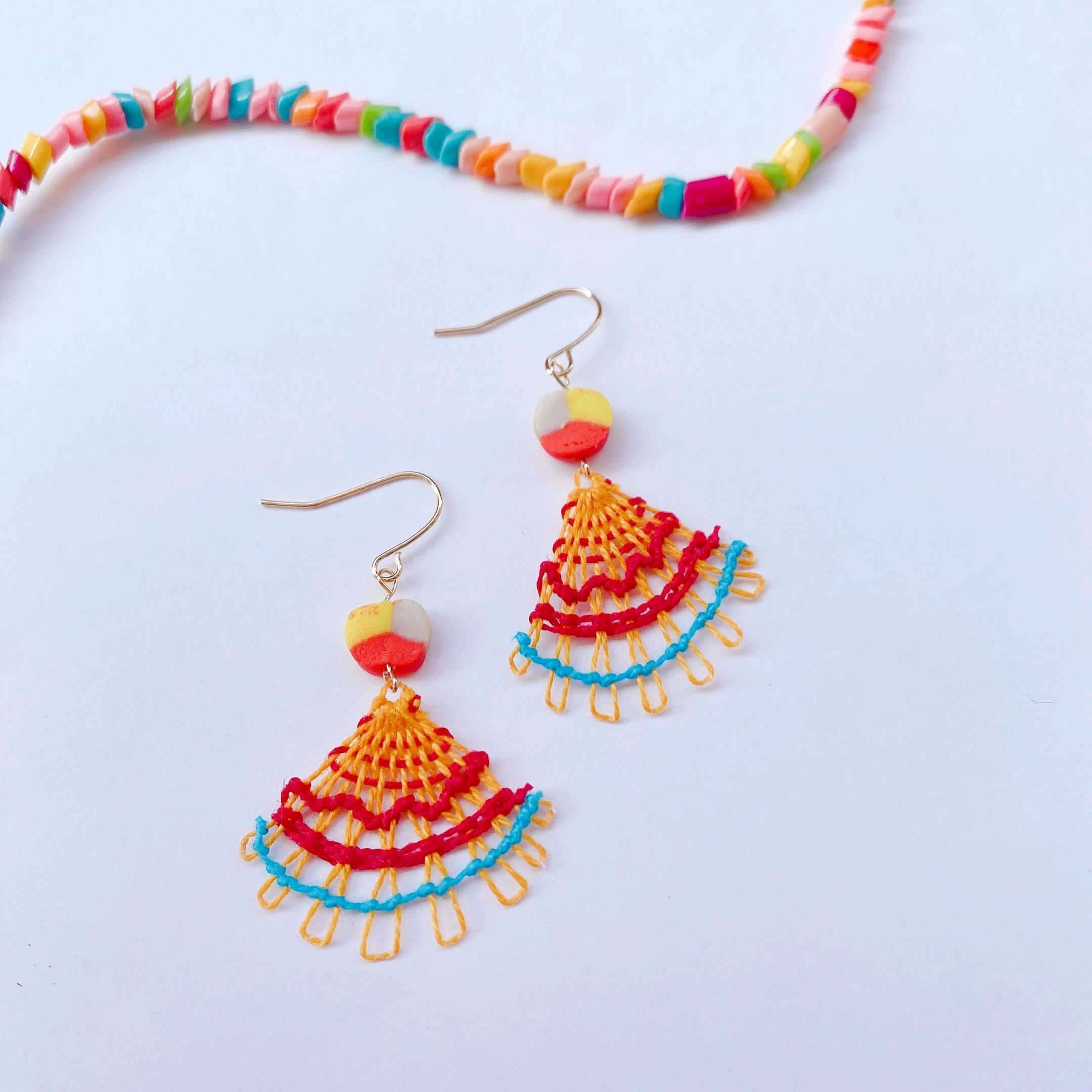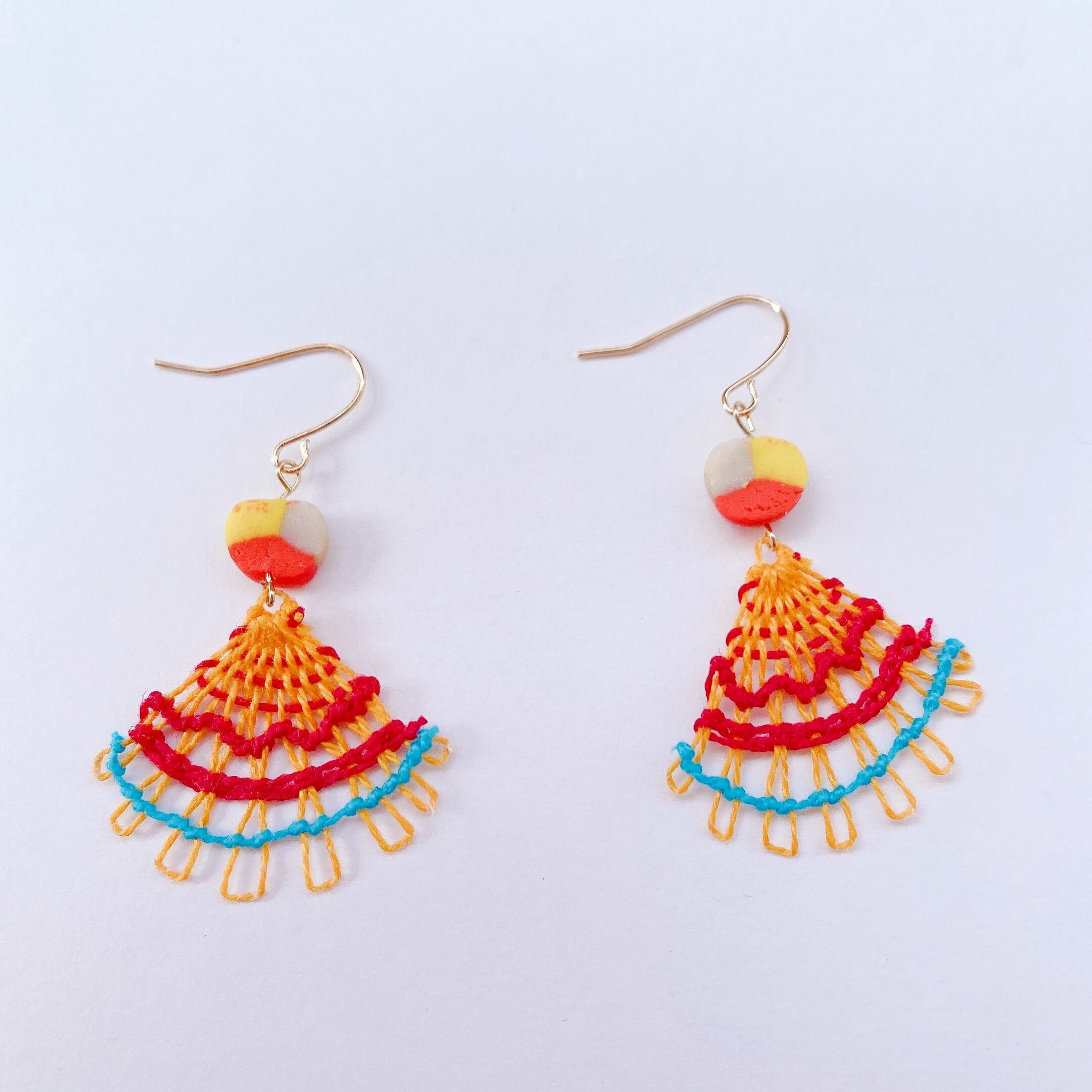 [材料]      エッグイエロー・レッド・スカイブルー糸・オリジナル樹脂ビーズ・ピアス金具