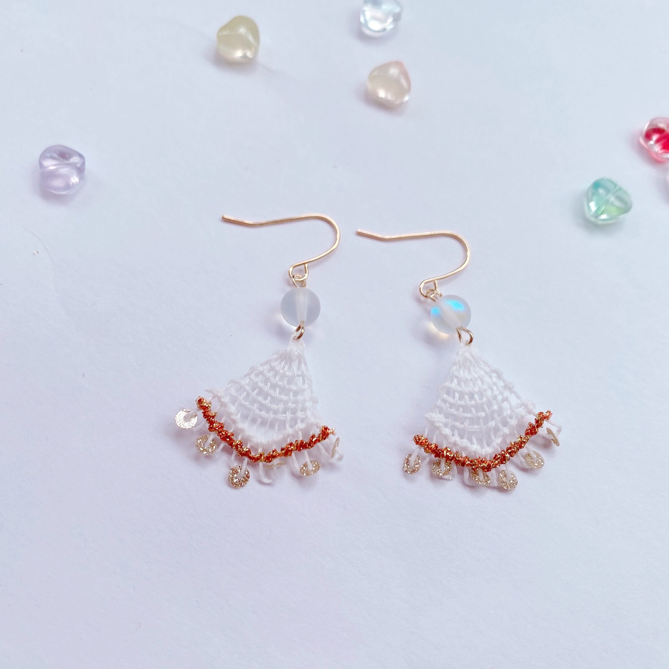 [材料]      ホワイト・ブラウンラメ糸・ガラスビーズ・スパンコール・ピアス金具