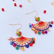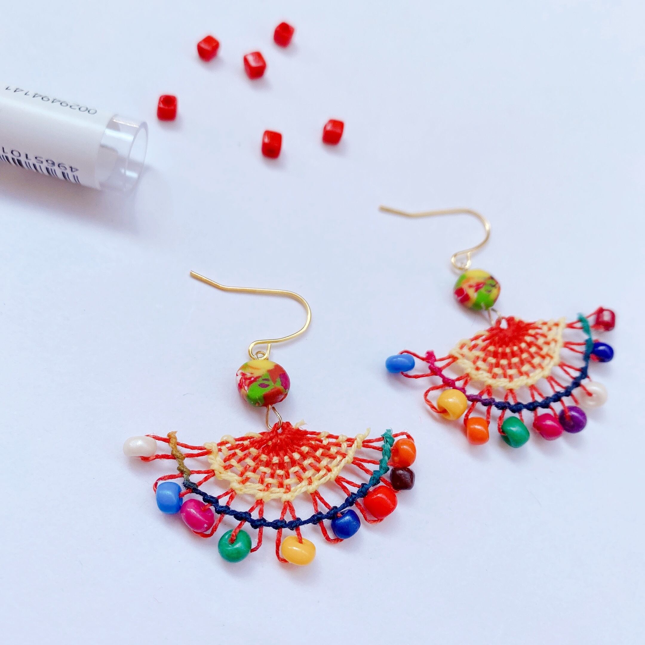 [材料]      赤色・薄いイエロー・グラデーション糸・ガラスビーズ・オリジナル樹脂・ピアス金具