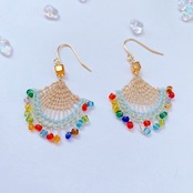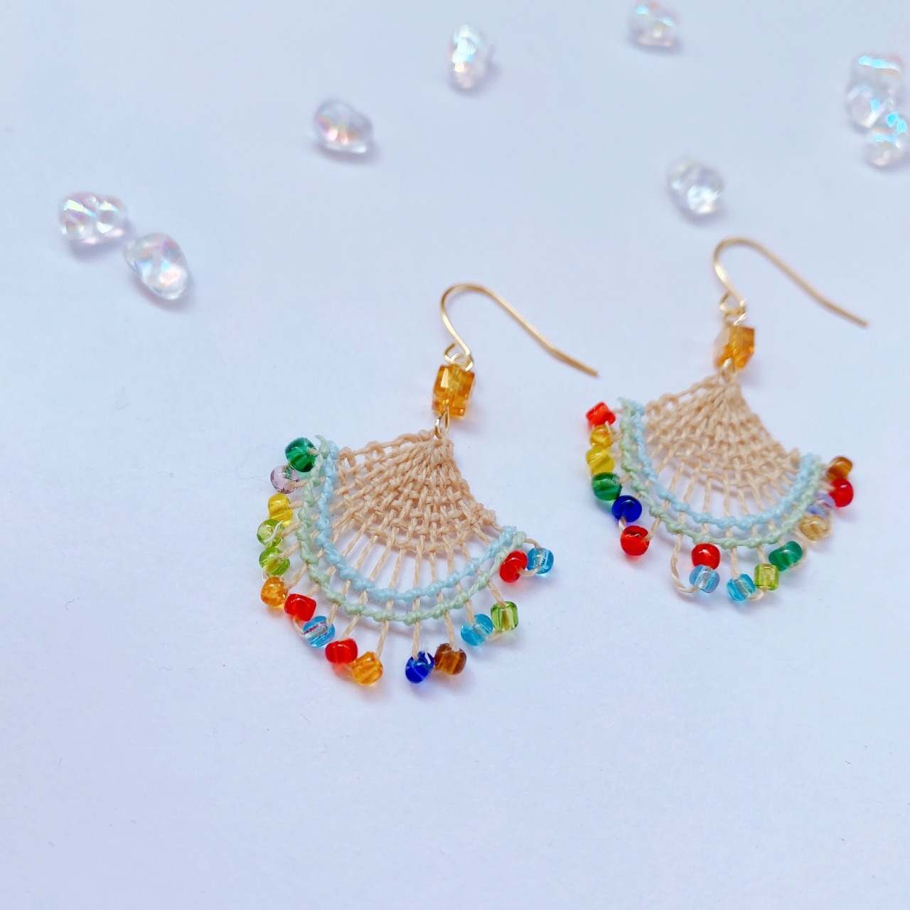 カラフルな透明ガラスのビーズをたくさん使って生成色と合わせました。
