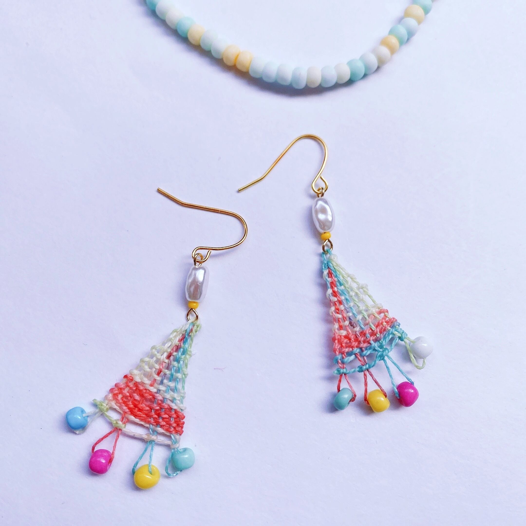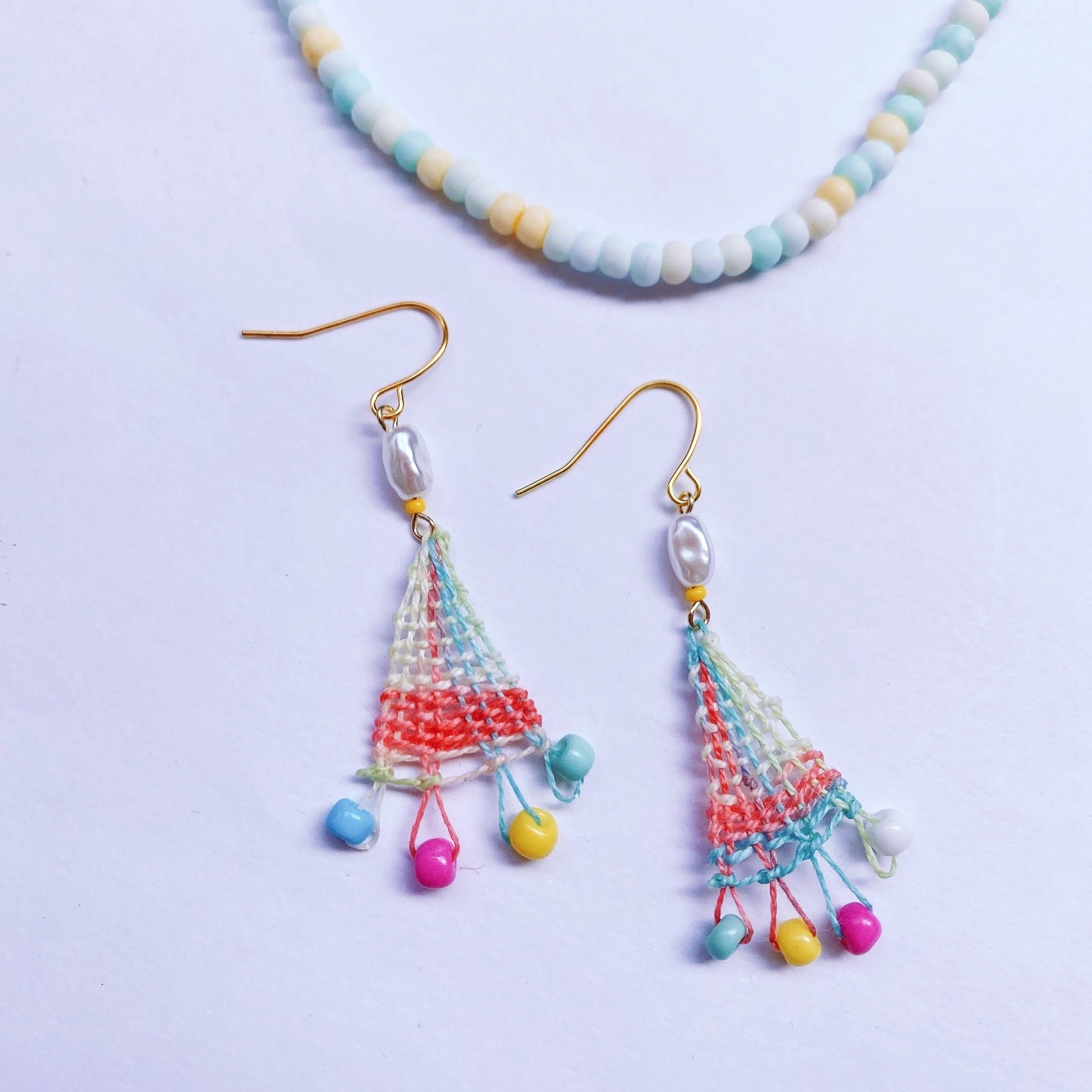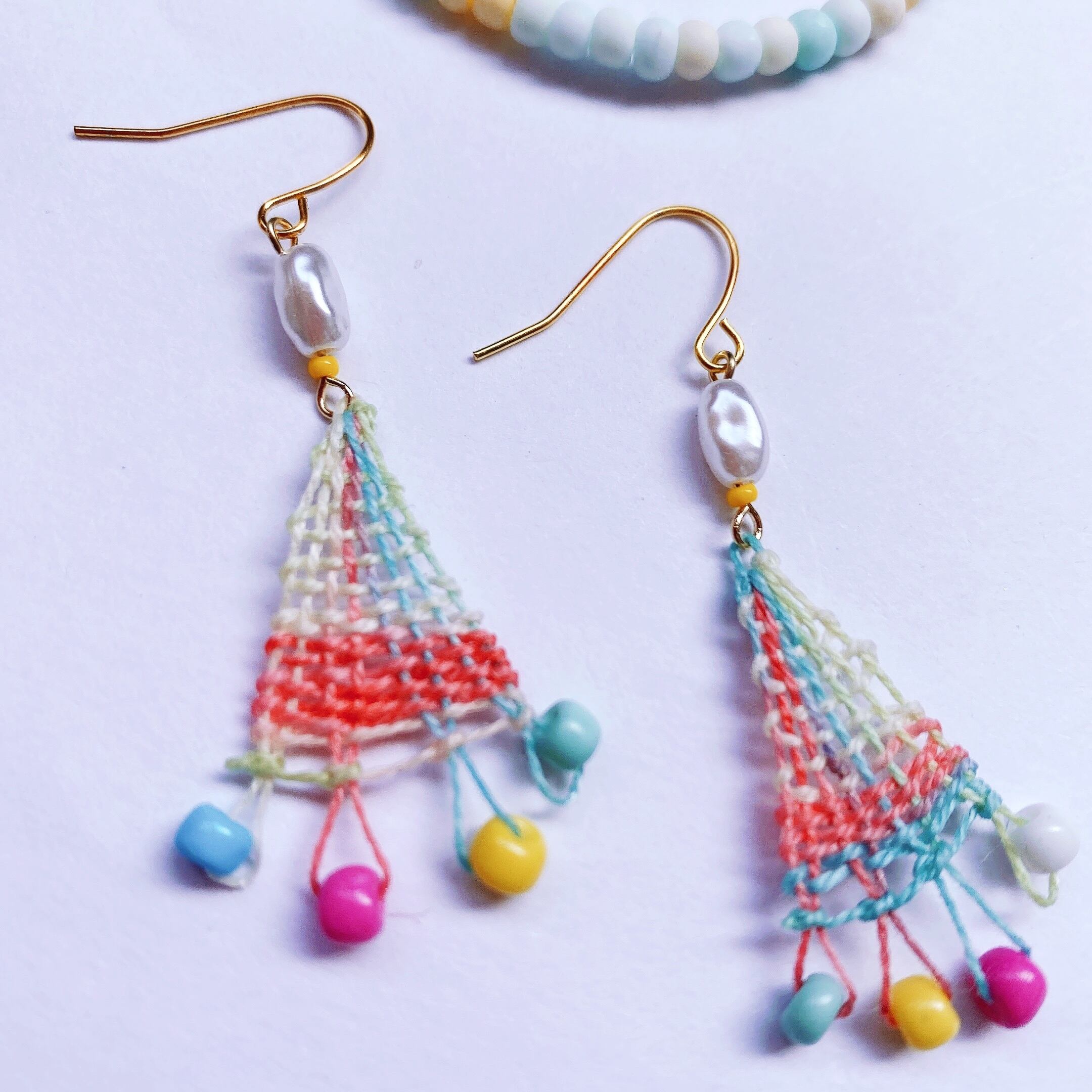 [材料]     ホワイト色糸・グラデーション糸・ガラスビーズ・ピアス金具