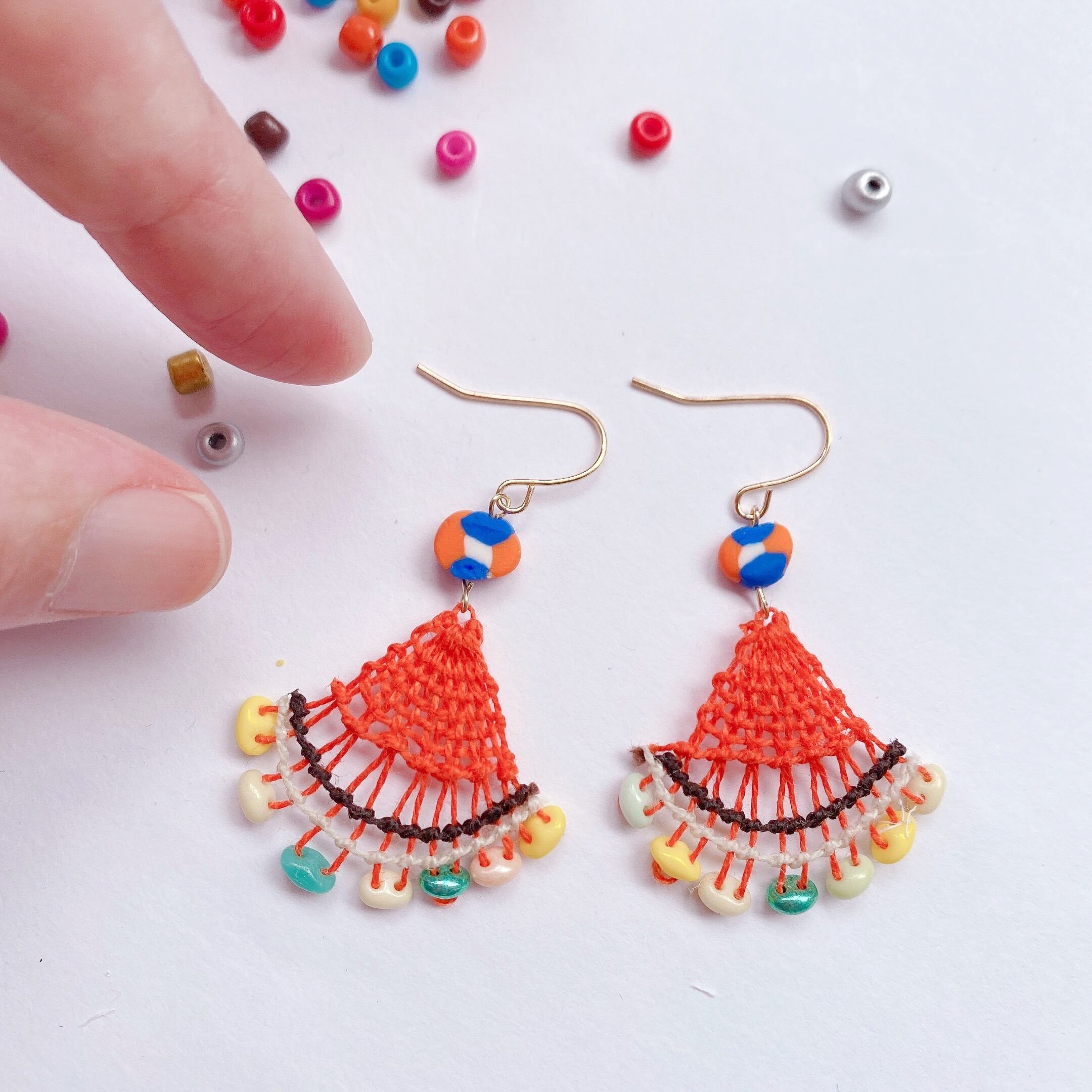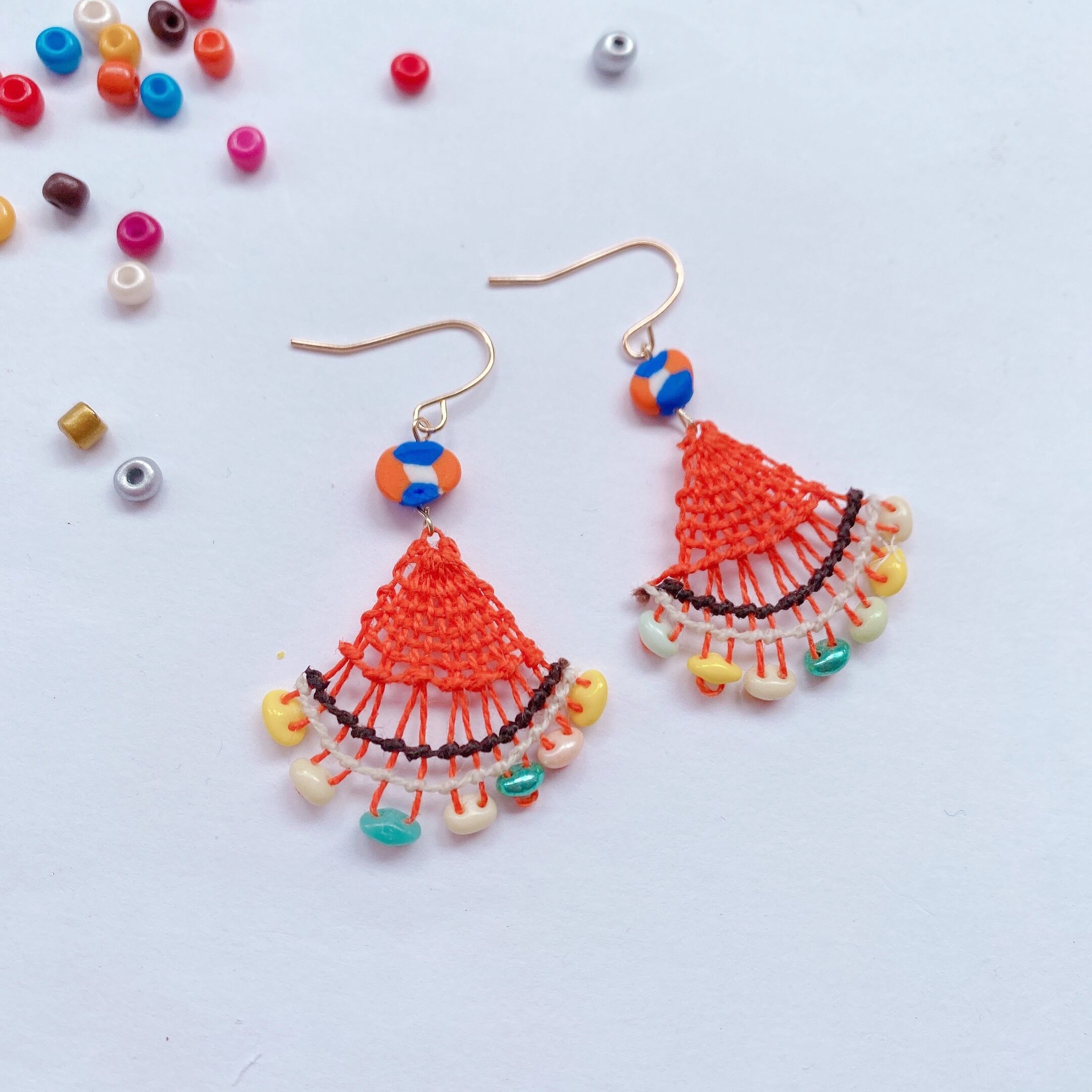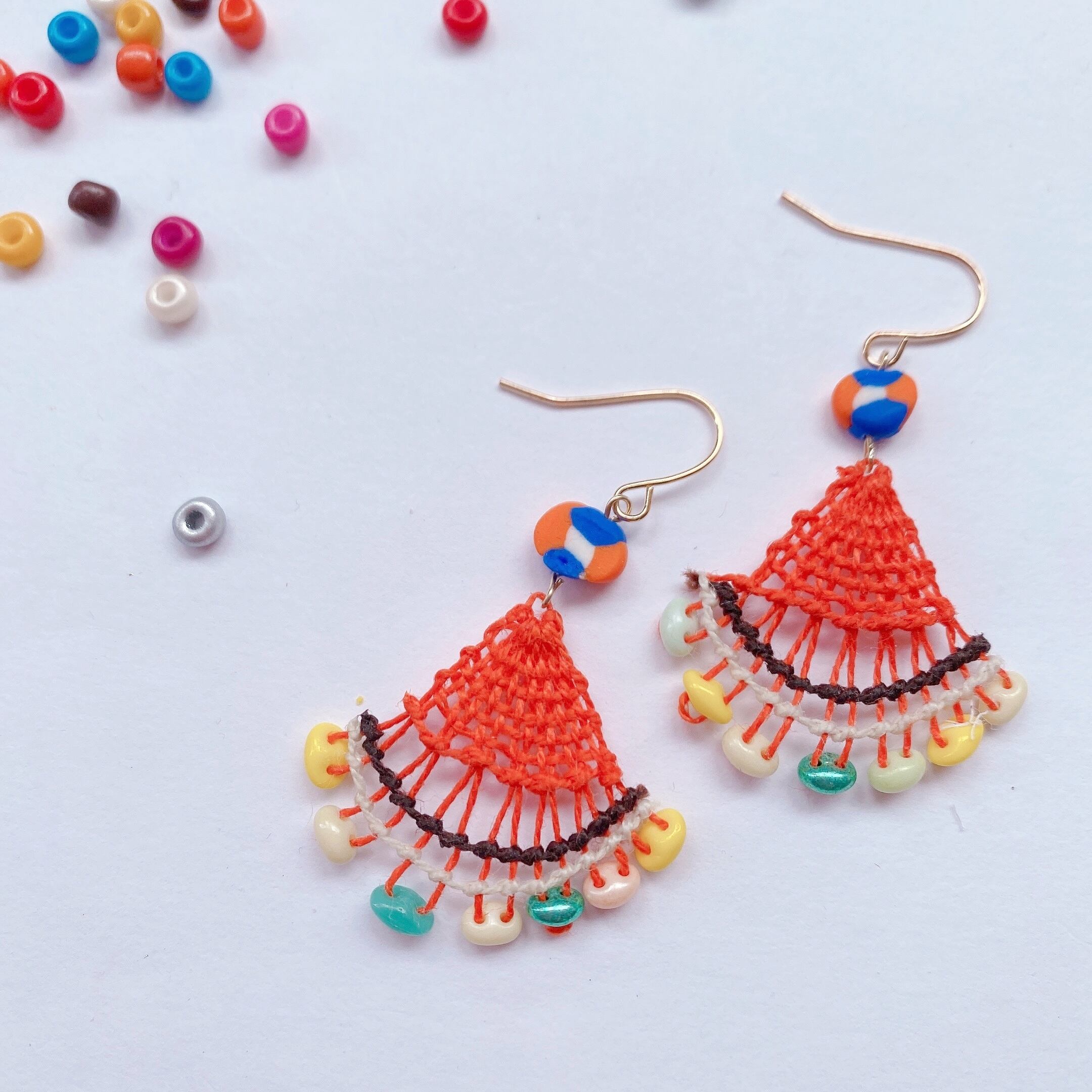 [材料]     オレンジ色糸・紺色・白色糸・ガラスビーズ・オリジナル樹脂ビーズ・ピアス金具