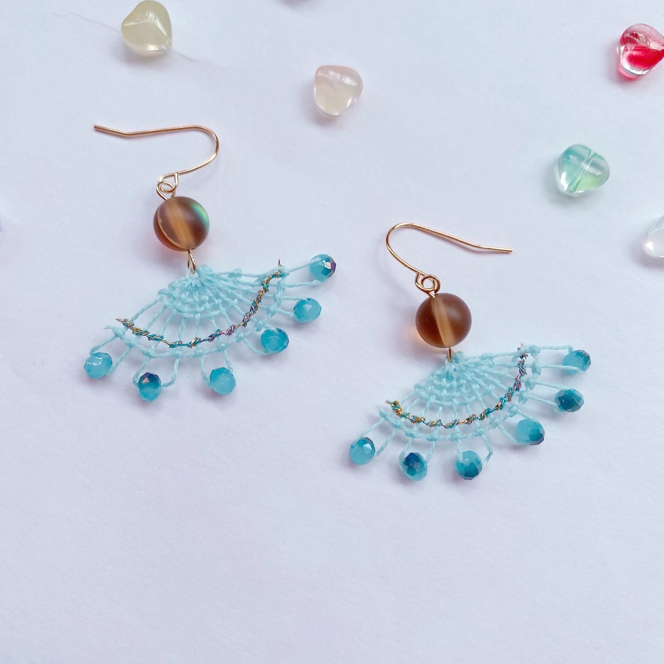 [材料]     薄い水色糸・段染めシルバー糸・天然石ビーズ・ガラスビーズ・ピアス金具