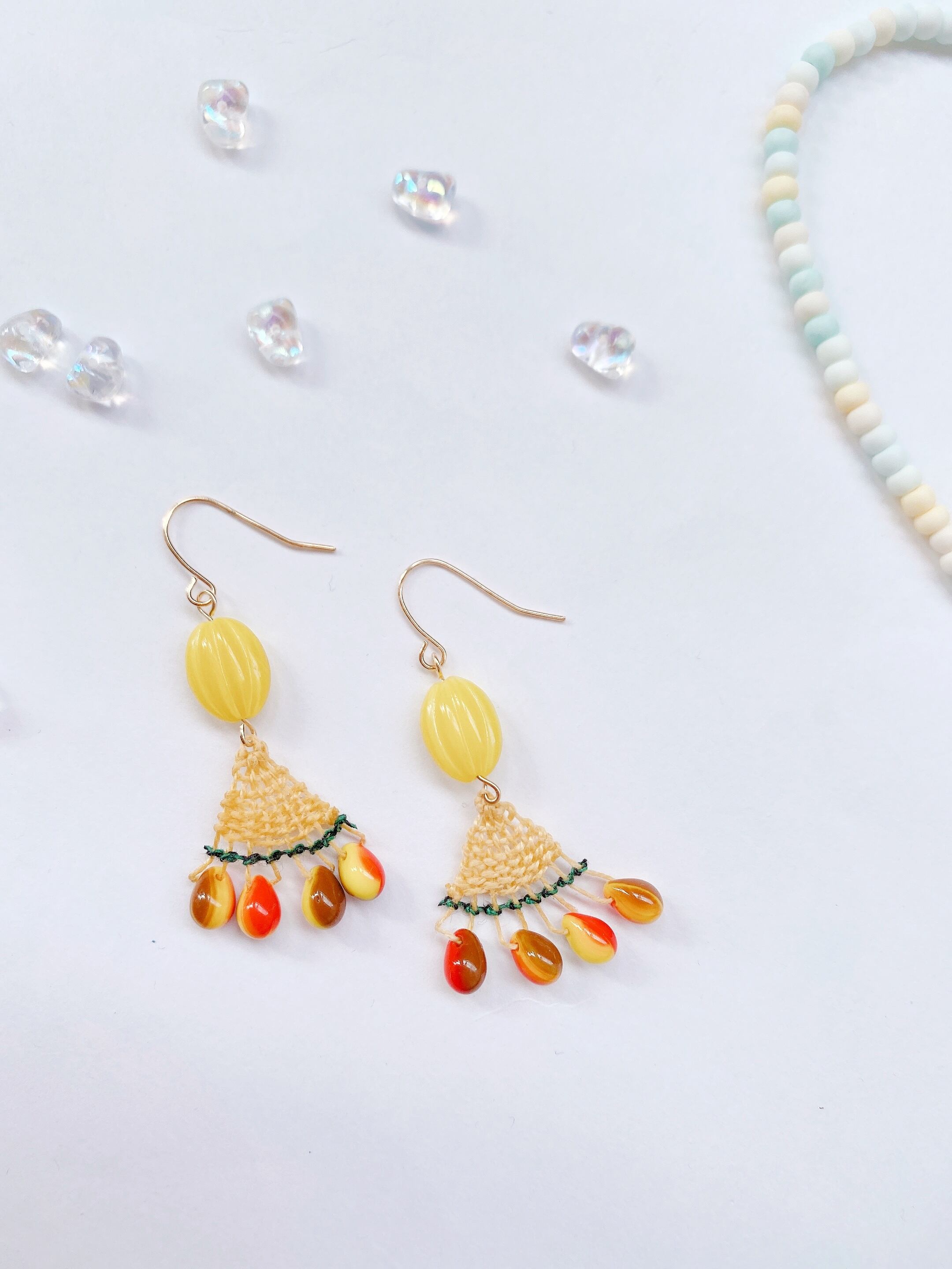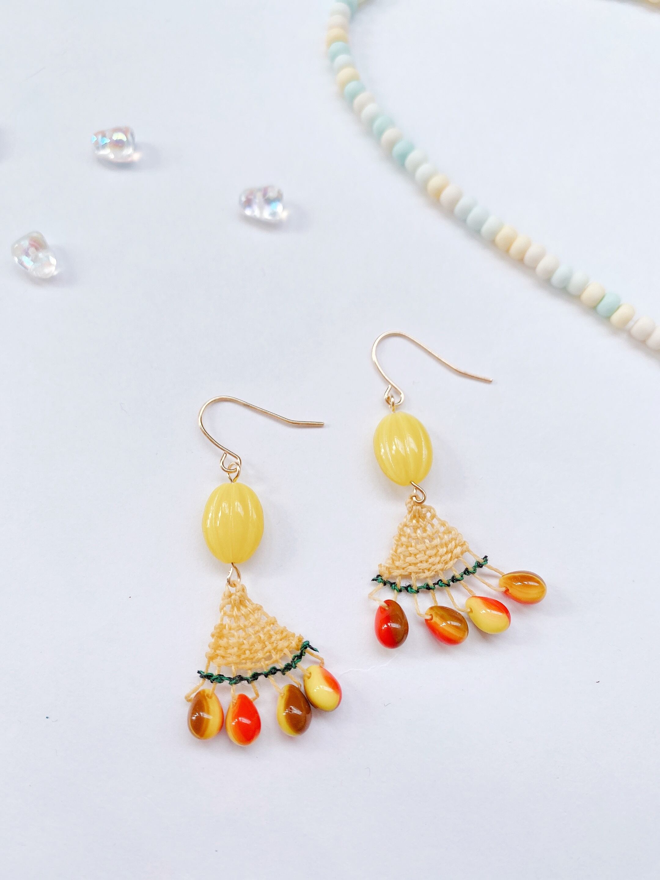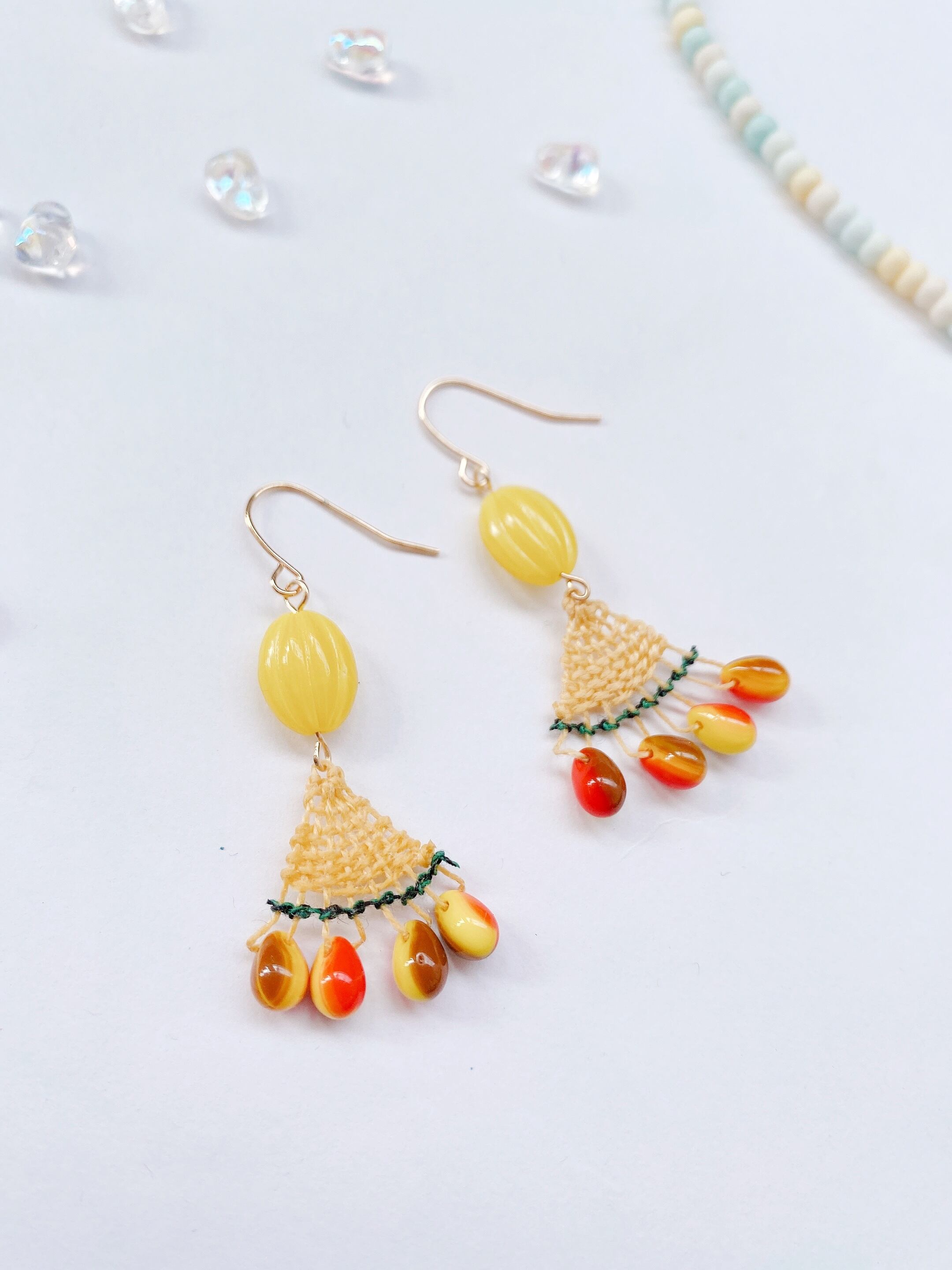 [材料]      薄めイエロー糸・グリーンストライプ糸・ガラスビーズ・ピアス金具
