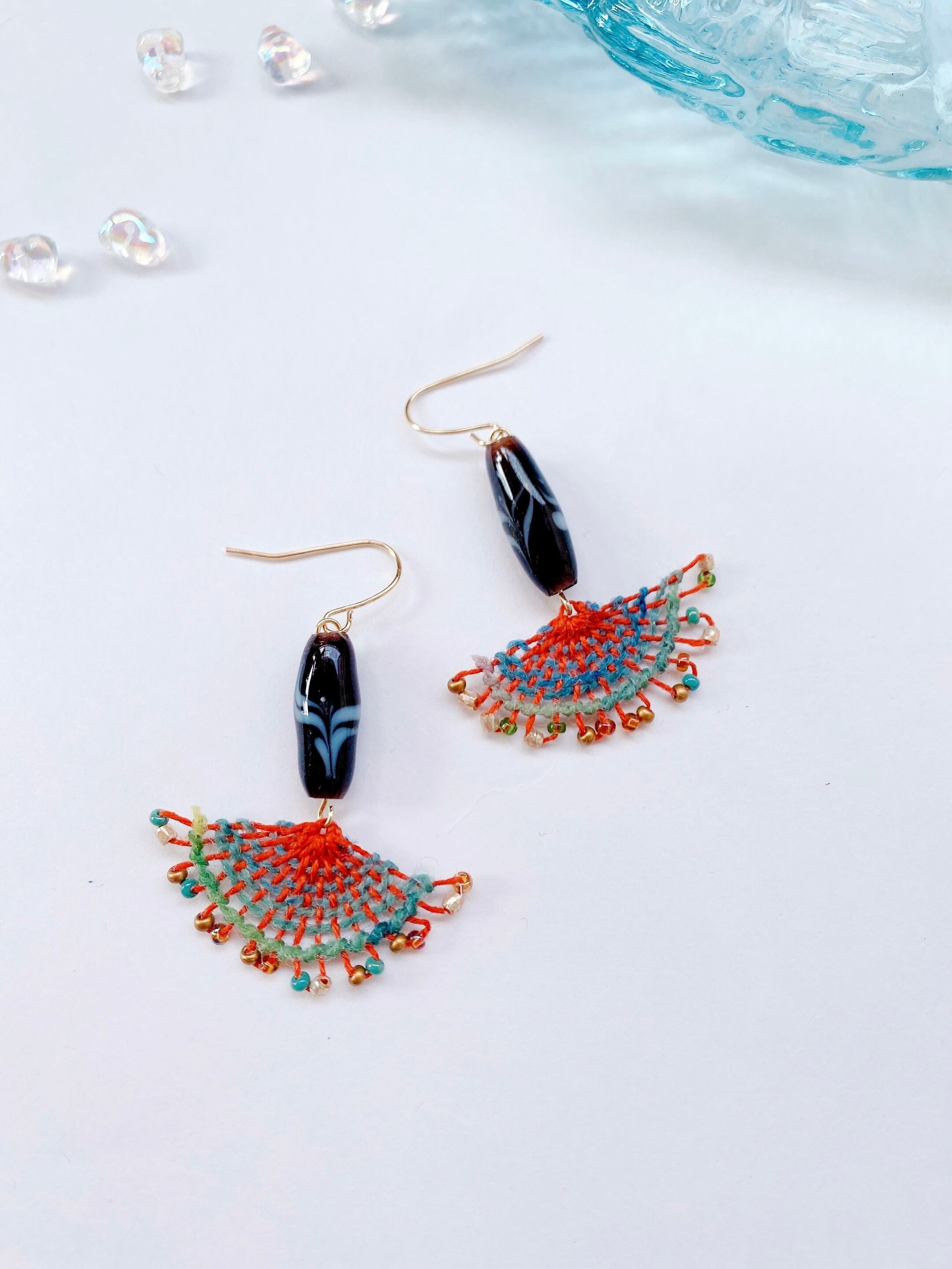 [材料]      赤色糸・手染め糸・ガラスビーズ・ピアス金具
