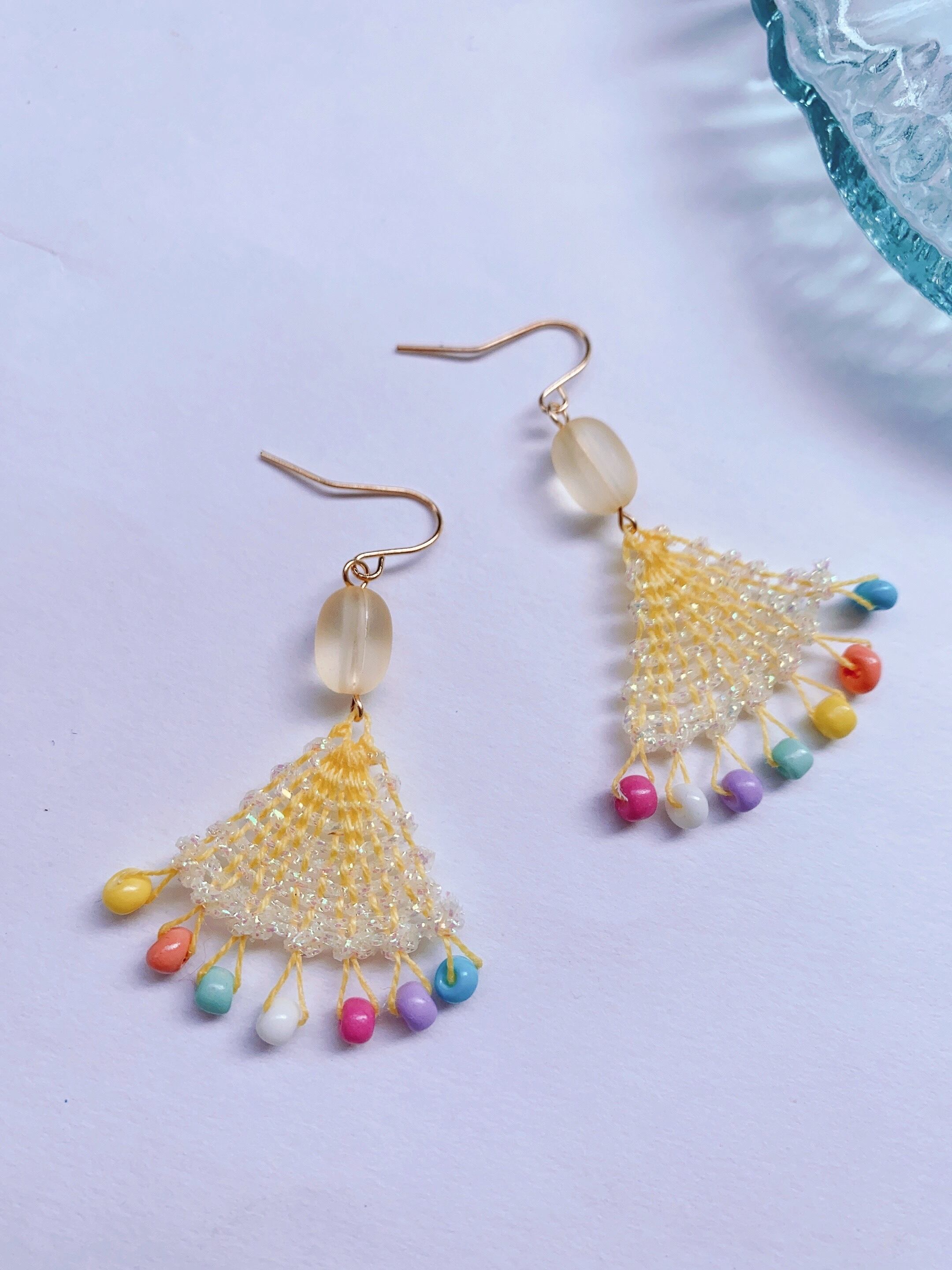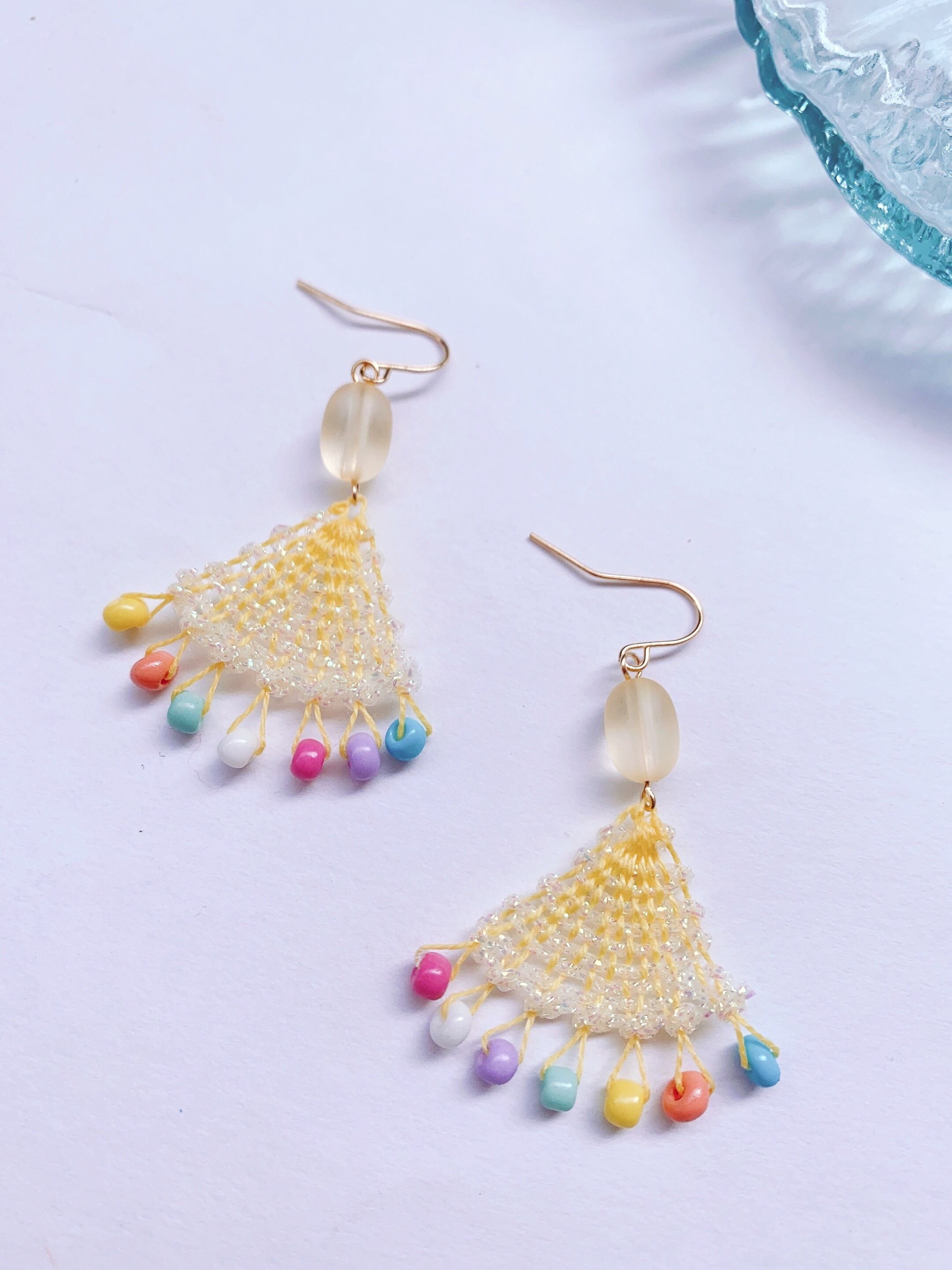 [材料]      薄い黄色糸・Modfilさんキラキラ糸・ガラスビーズ・ピアス金具