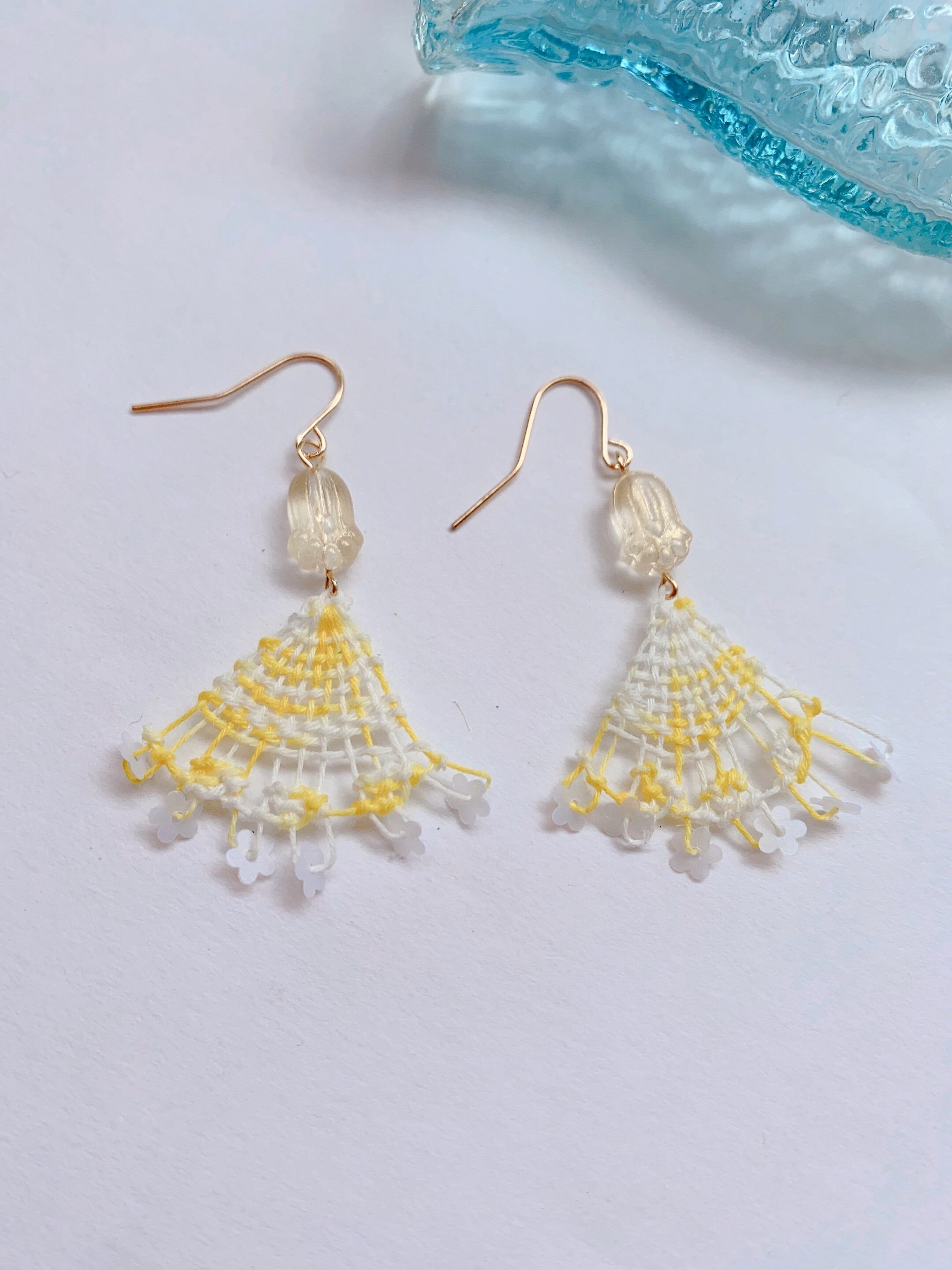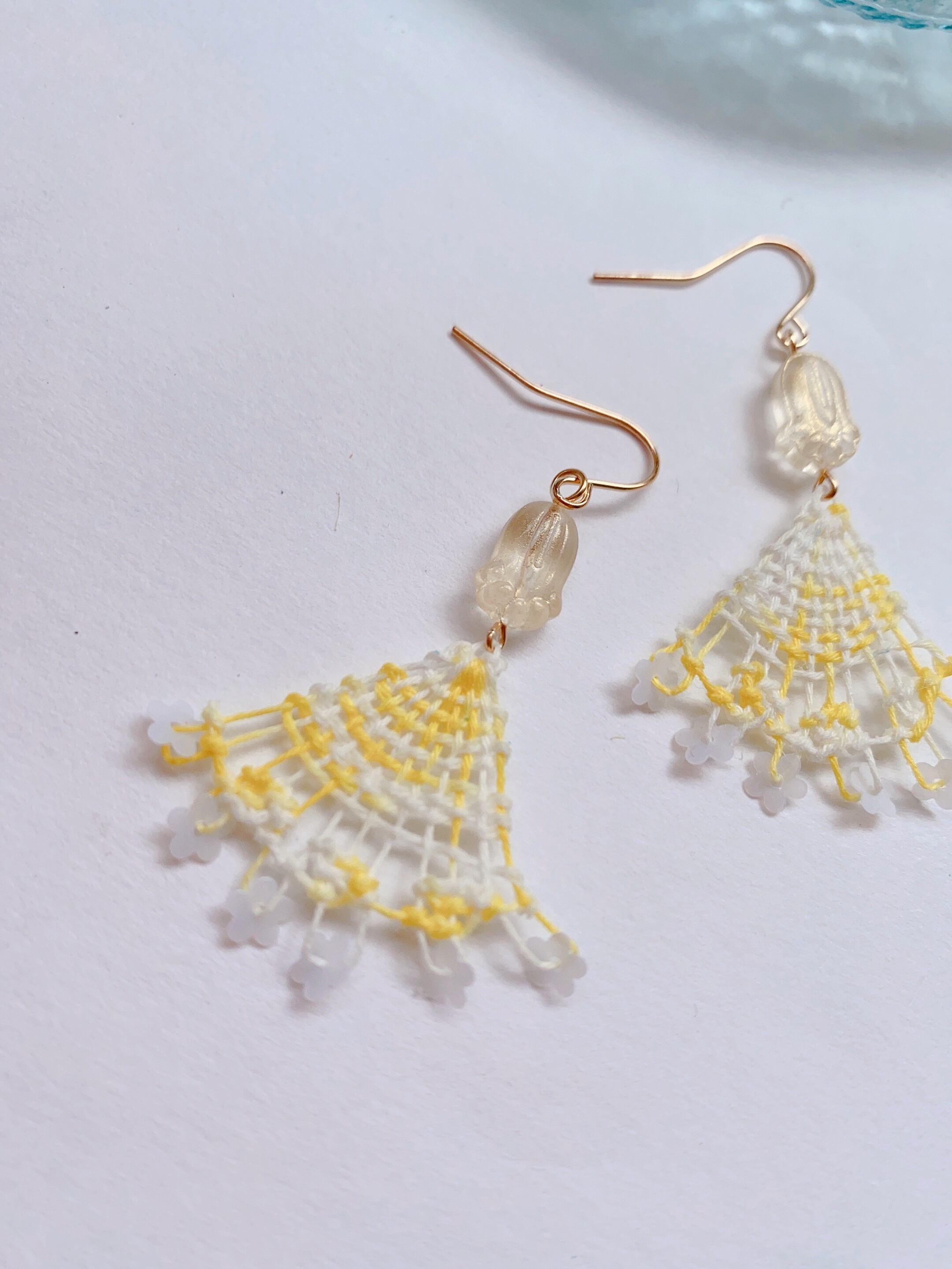 [材料]      黄色&白綿糸・ガラスビーズ・スパンコールビーズ・ピアス金具
