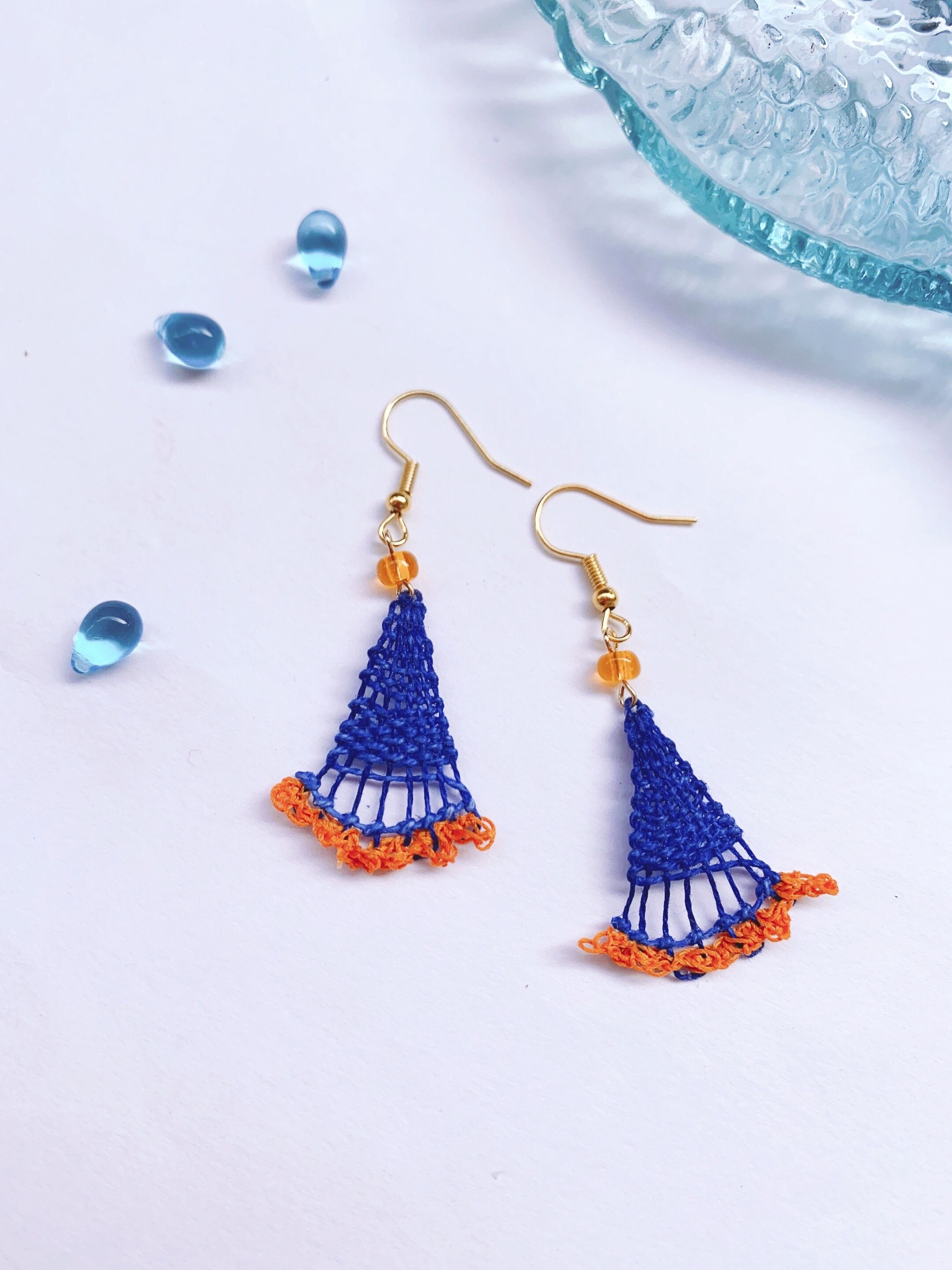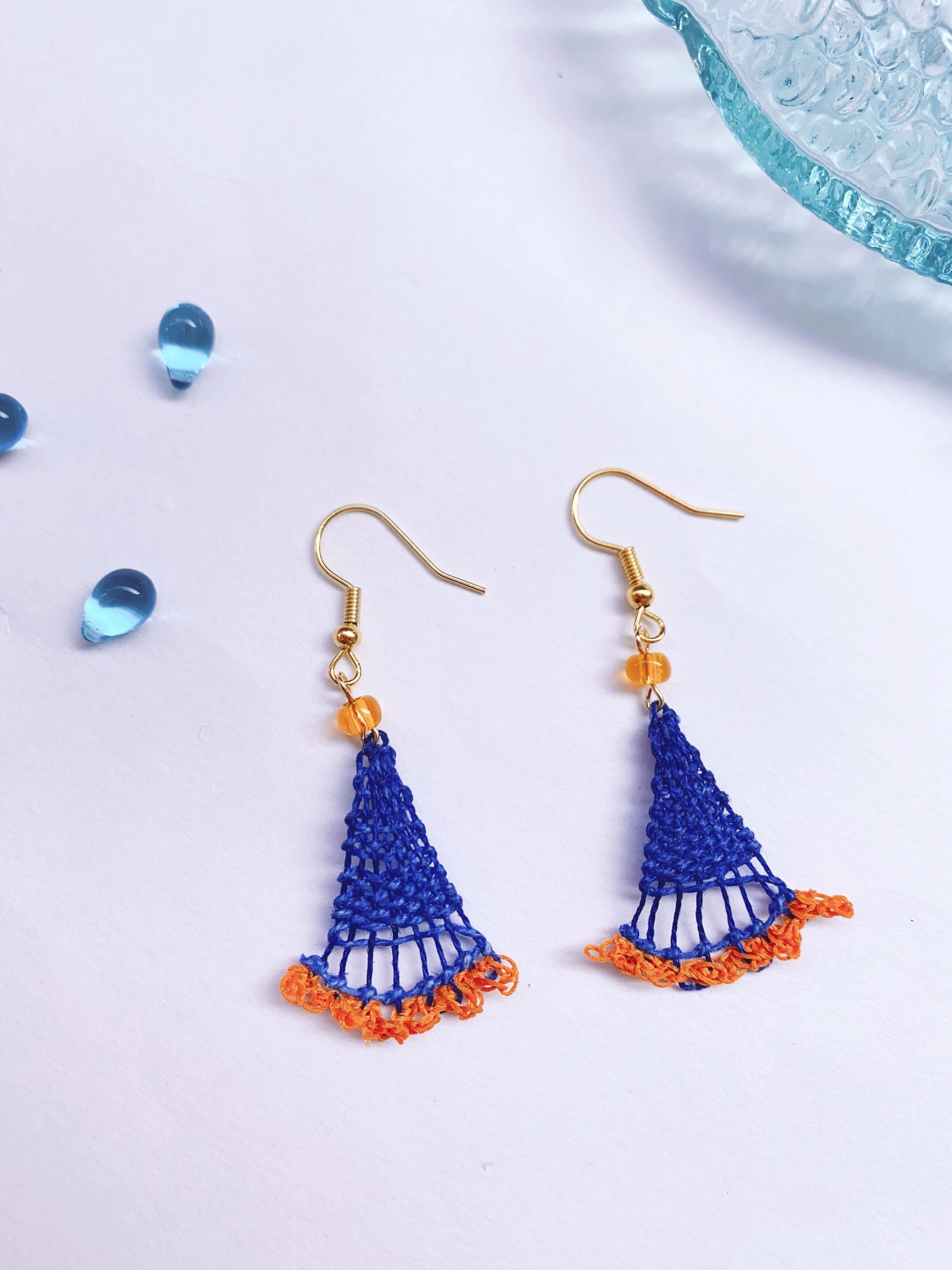[材料]      青色・オレンジ糸・ガラスビーズ・ピアス金具