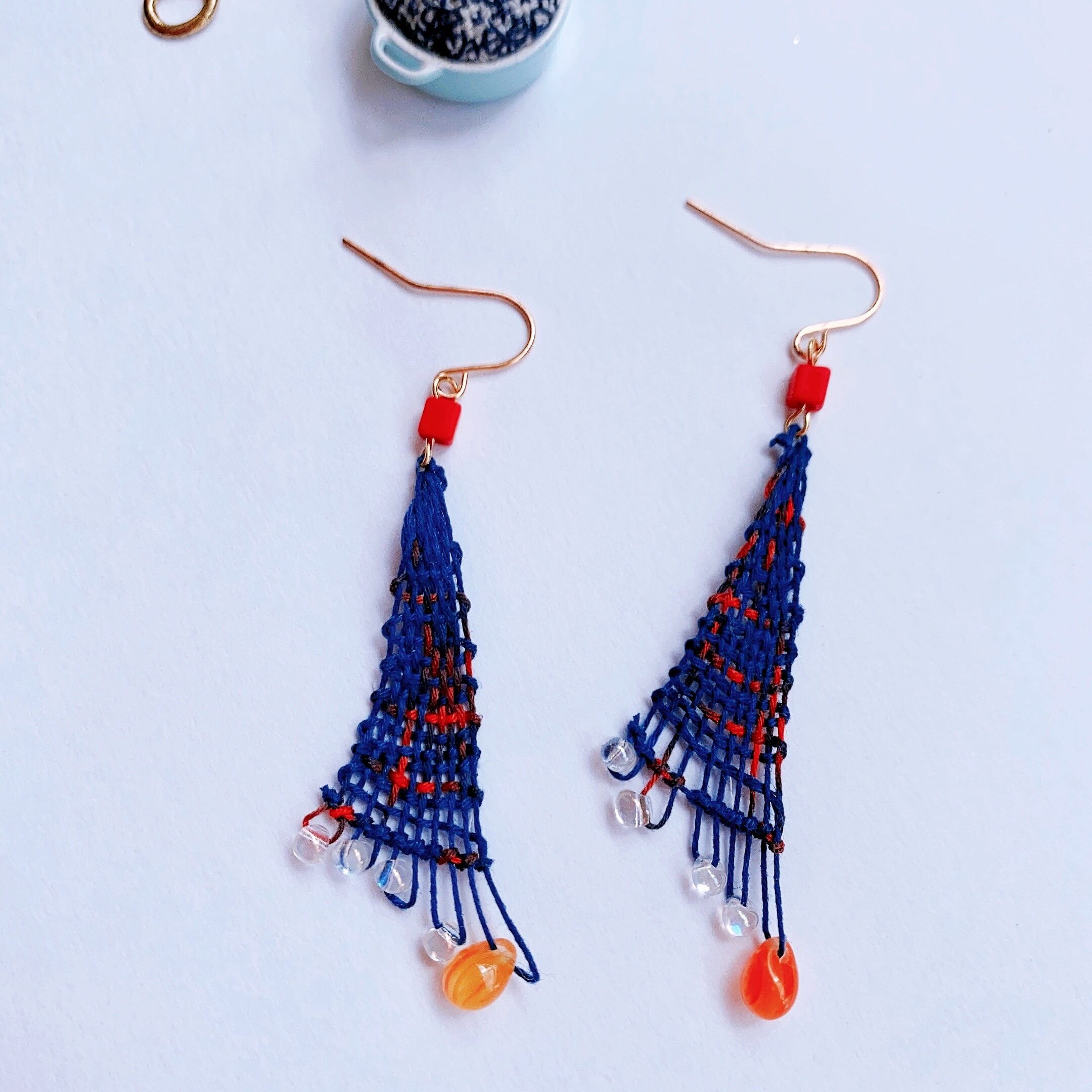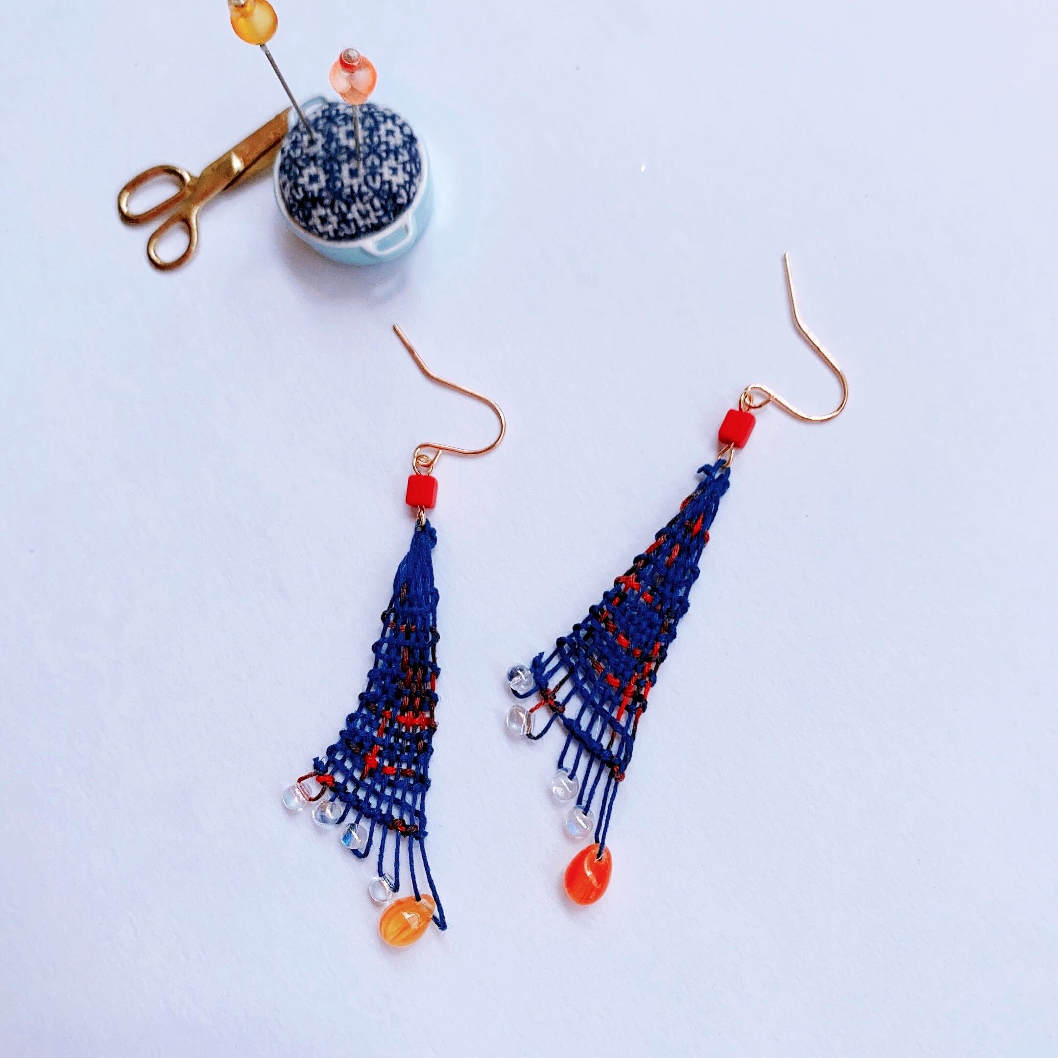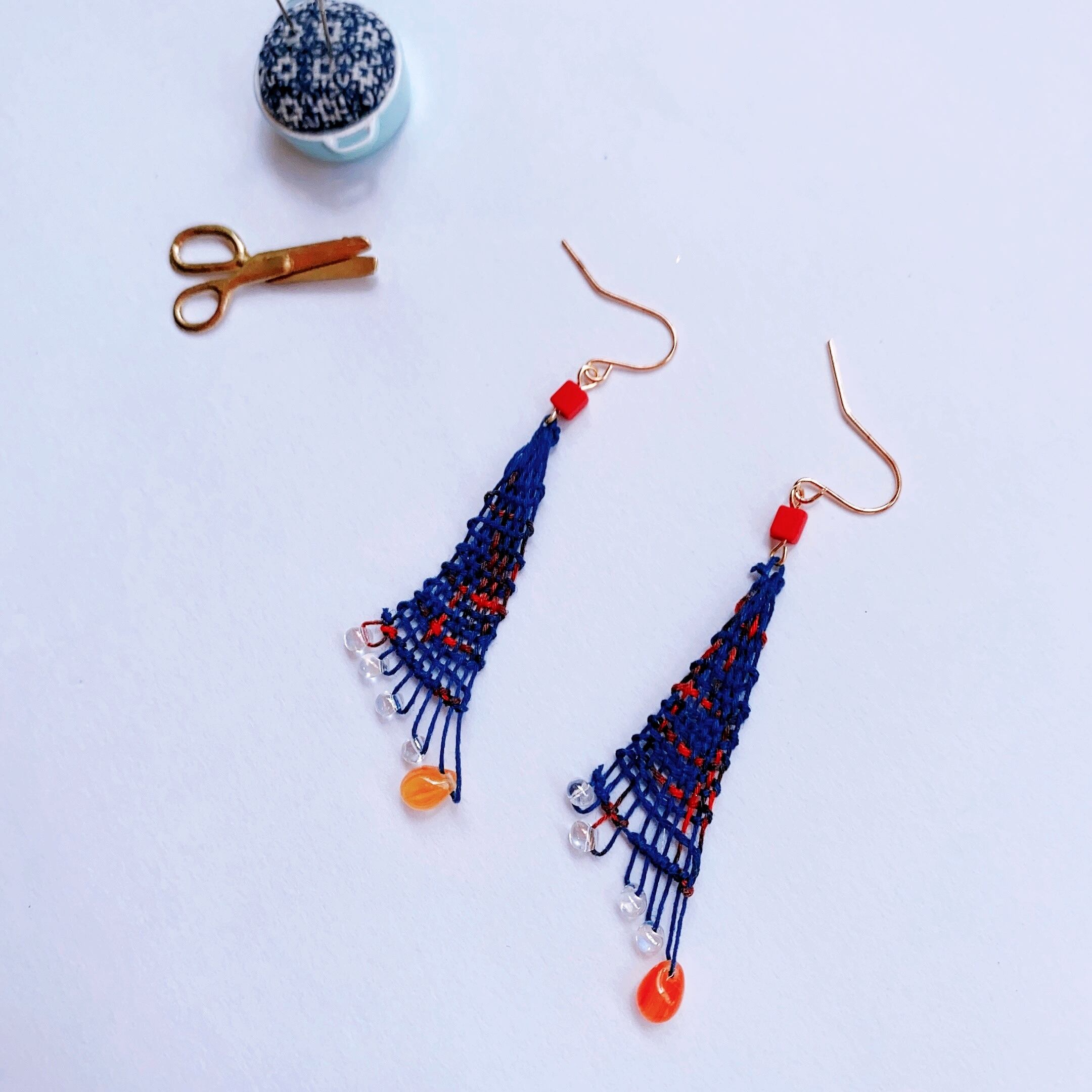 [材料]      青・オレンジ糸・ガラスビーズ・ピアス金具