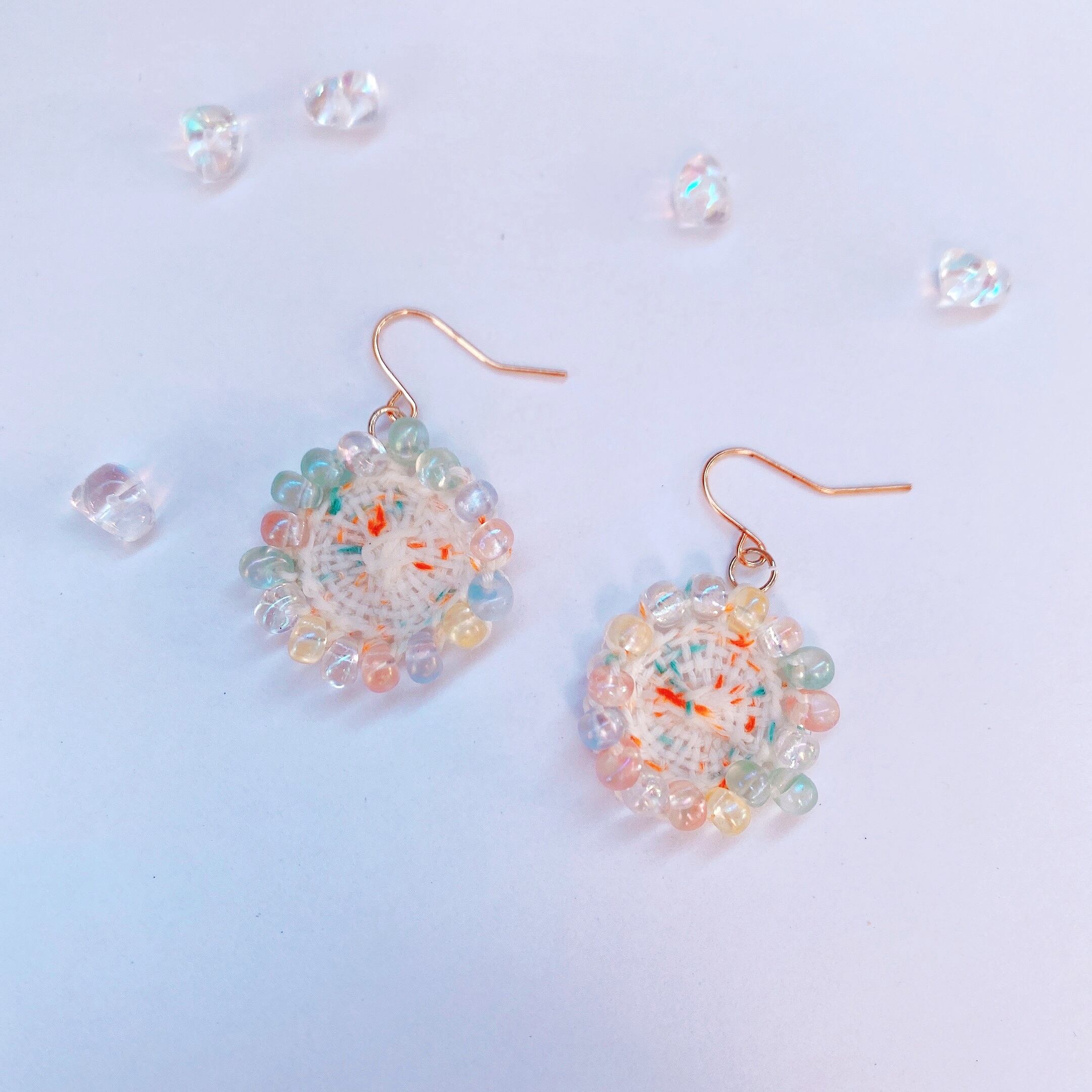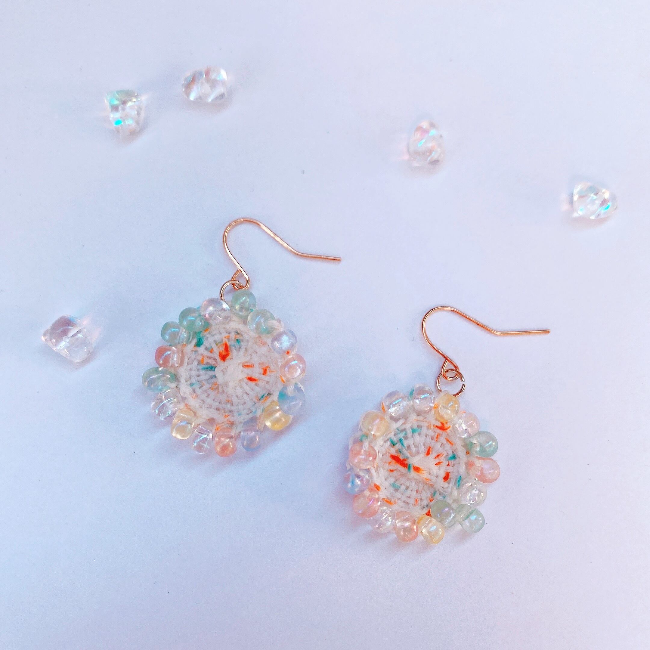 [材料]       ホワイトイエローピンク糸・ガラスビーズ・ピアス金具