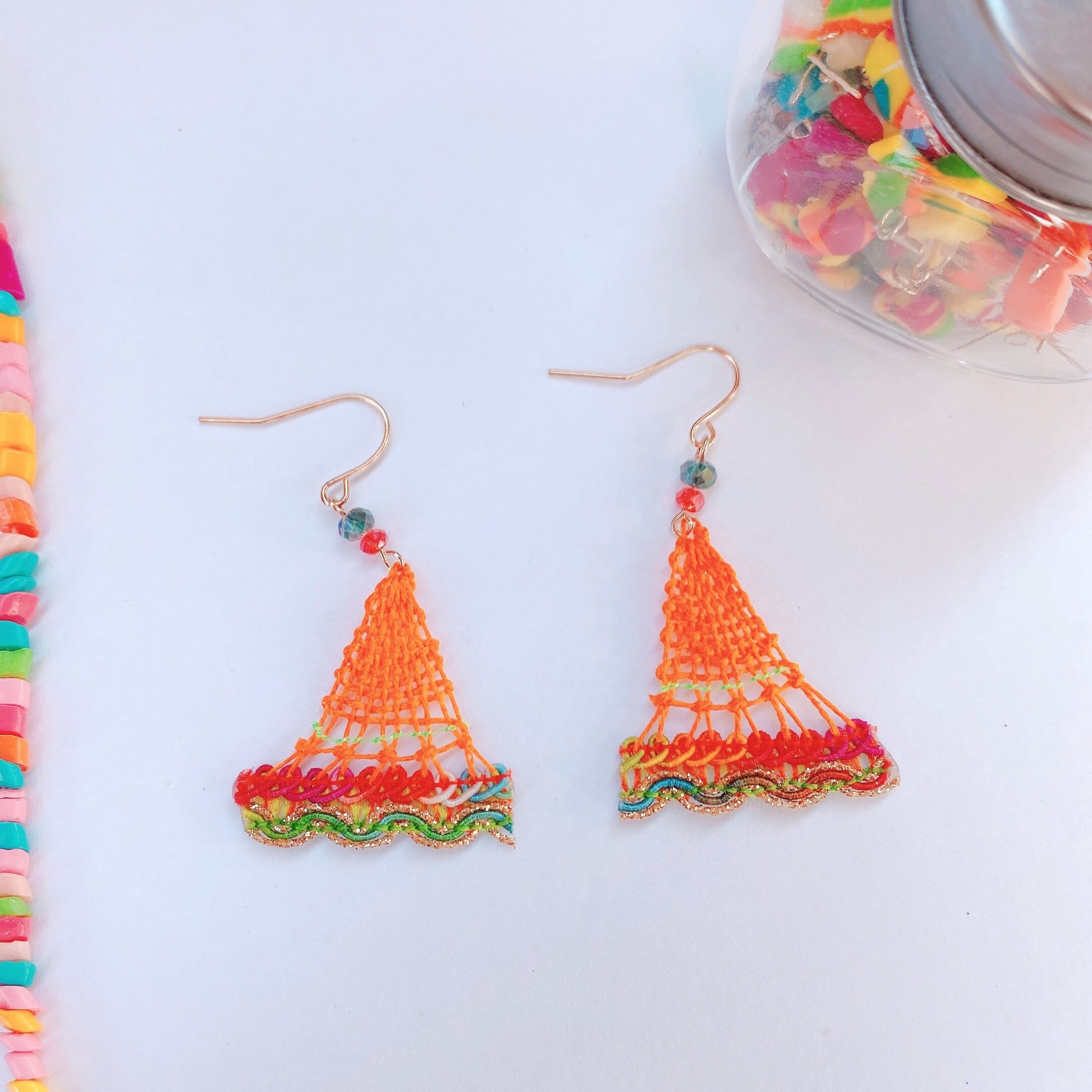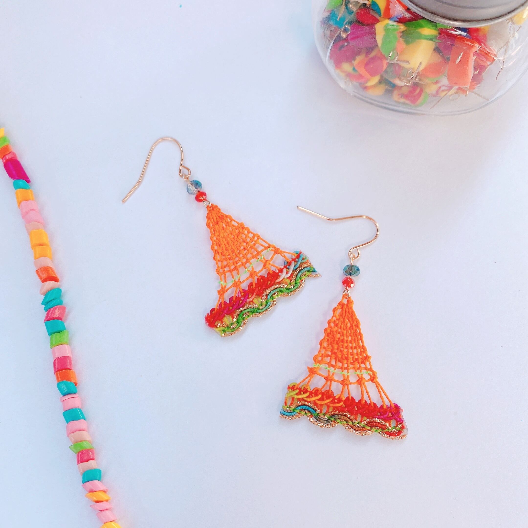 [材料]       オレンジ色糸・ガラスビーズ・インドカラー綿・ピアス金具