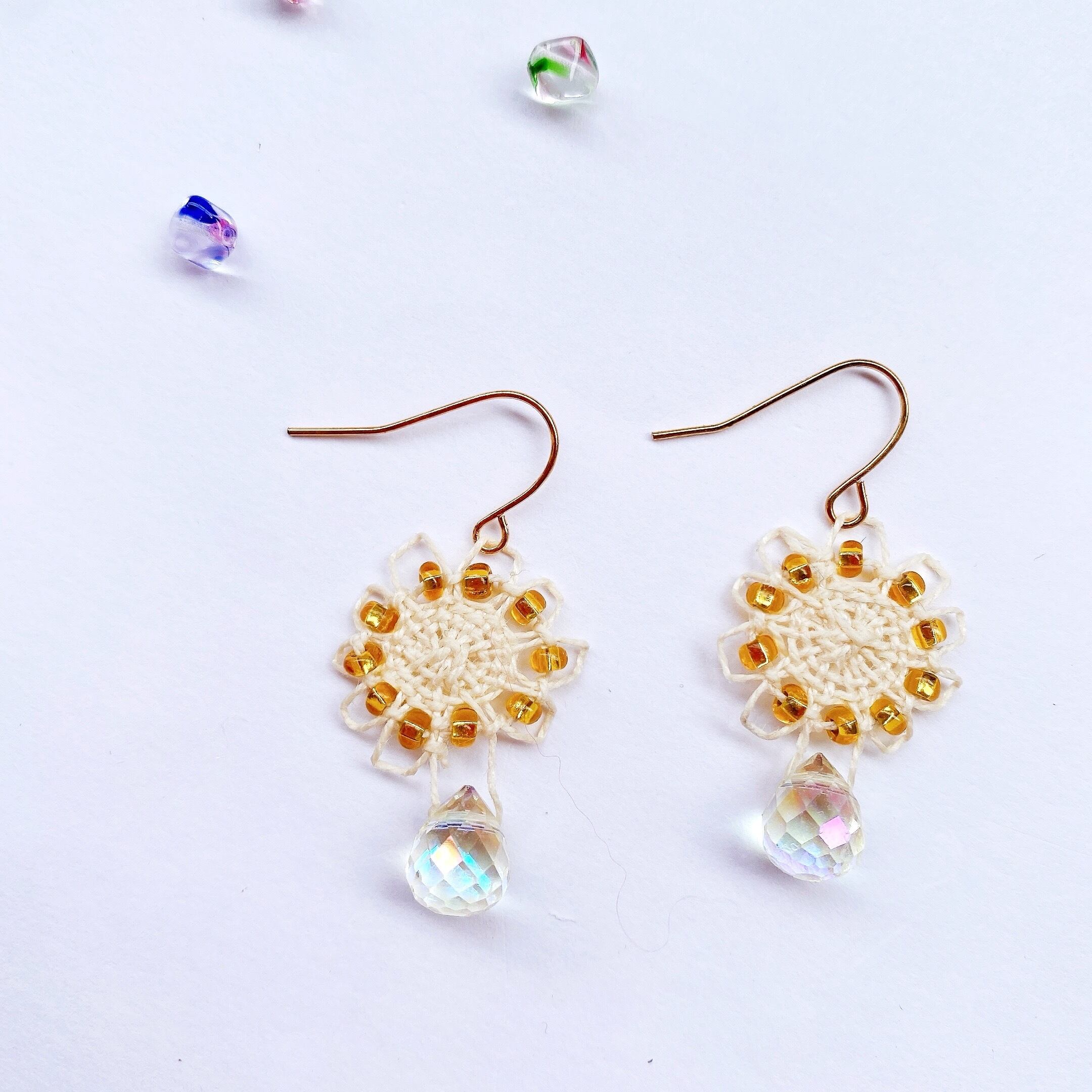 きなりカラーのホワイト糸とゴールドブラウンビーズを合わせて、ダイヤのような雫形ビーズをつけました。