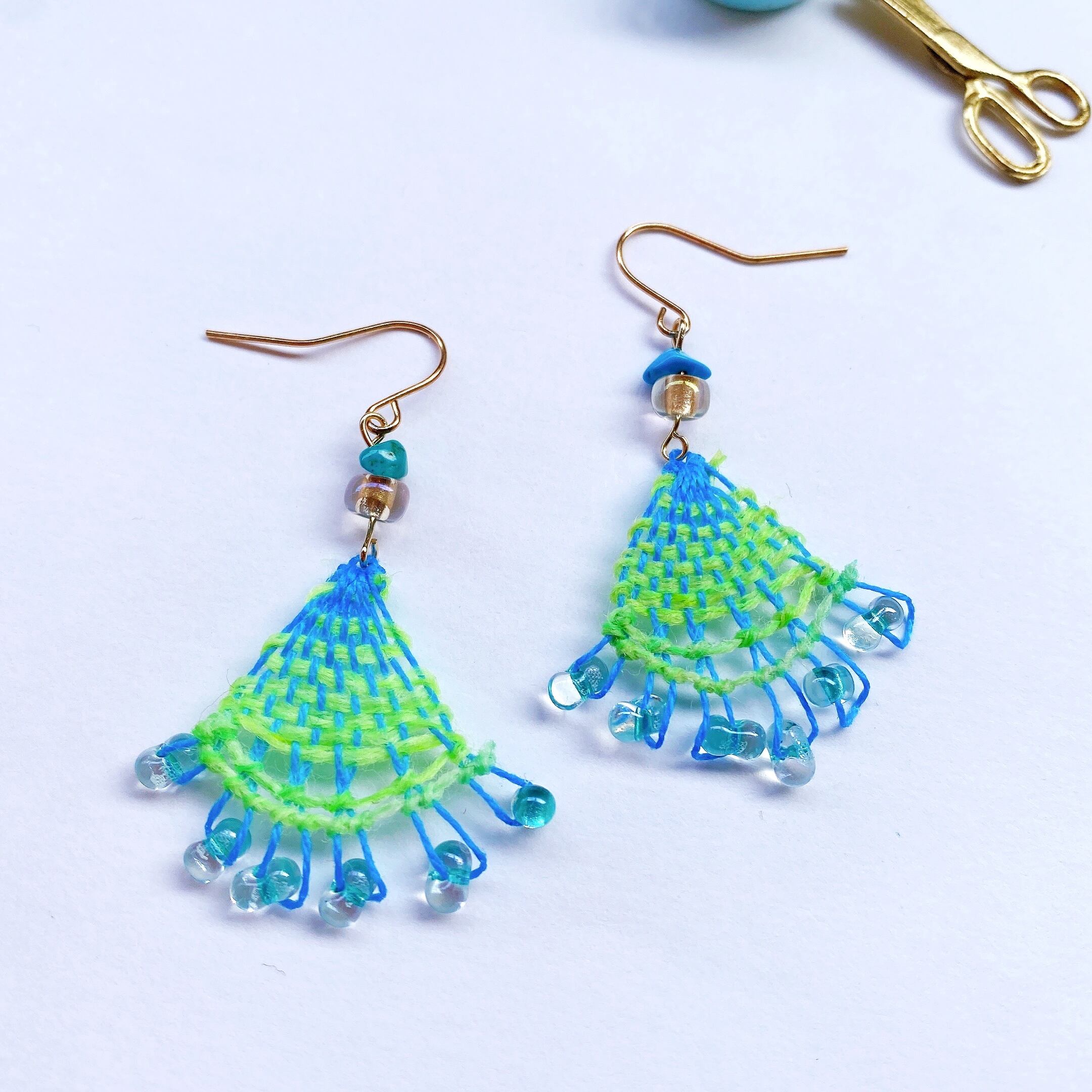 [材料]      エメラルドグリーン色・ブルー糸・ピアス金具