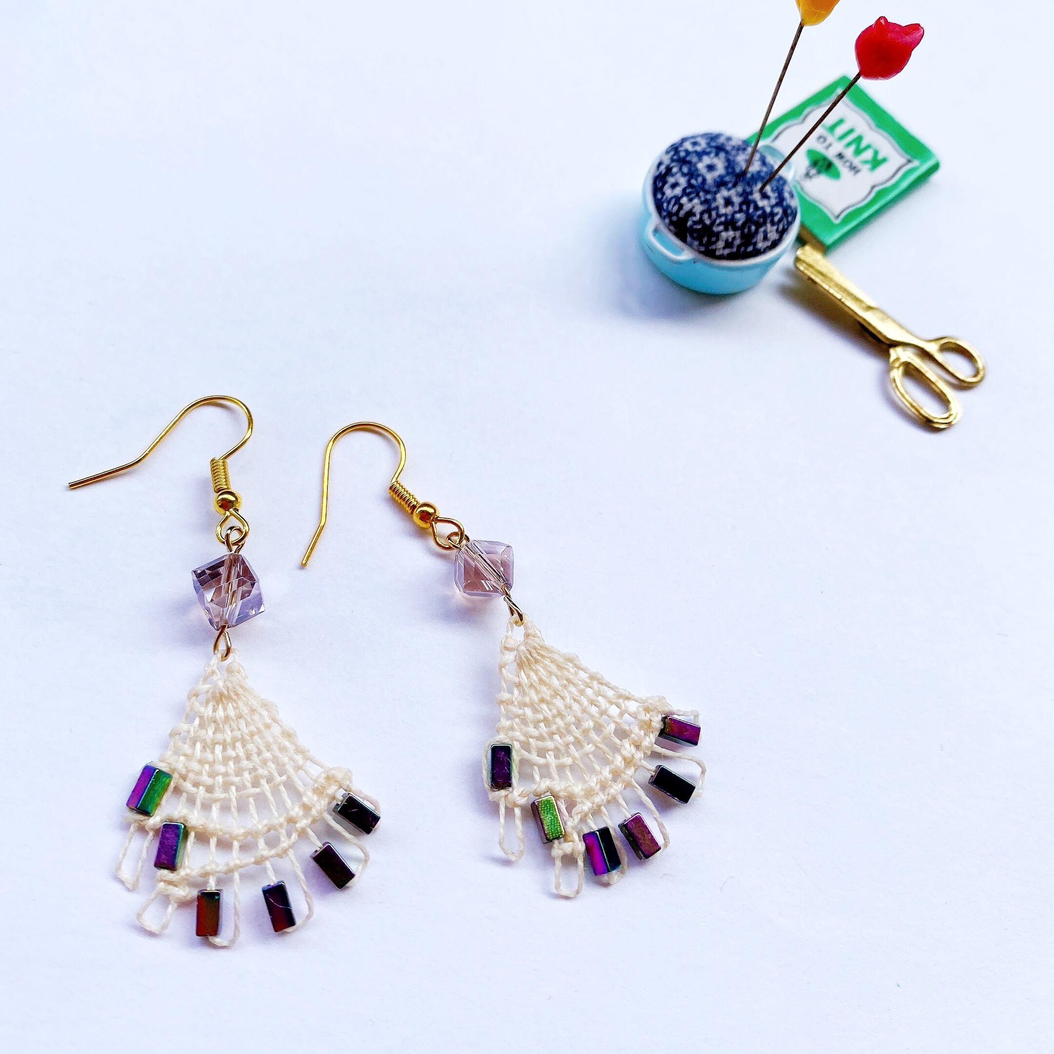 オーロラ色に輝く四角いビーズを白い糸に合わせました。