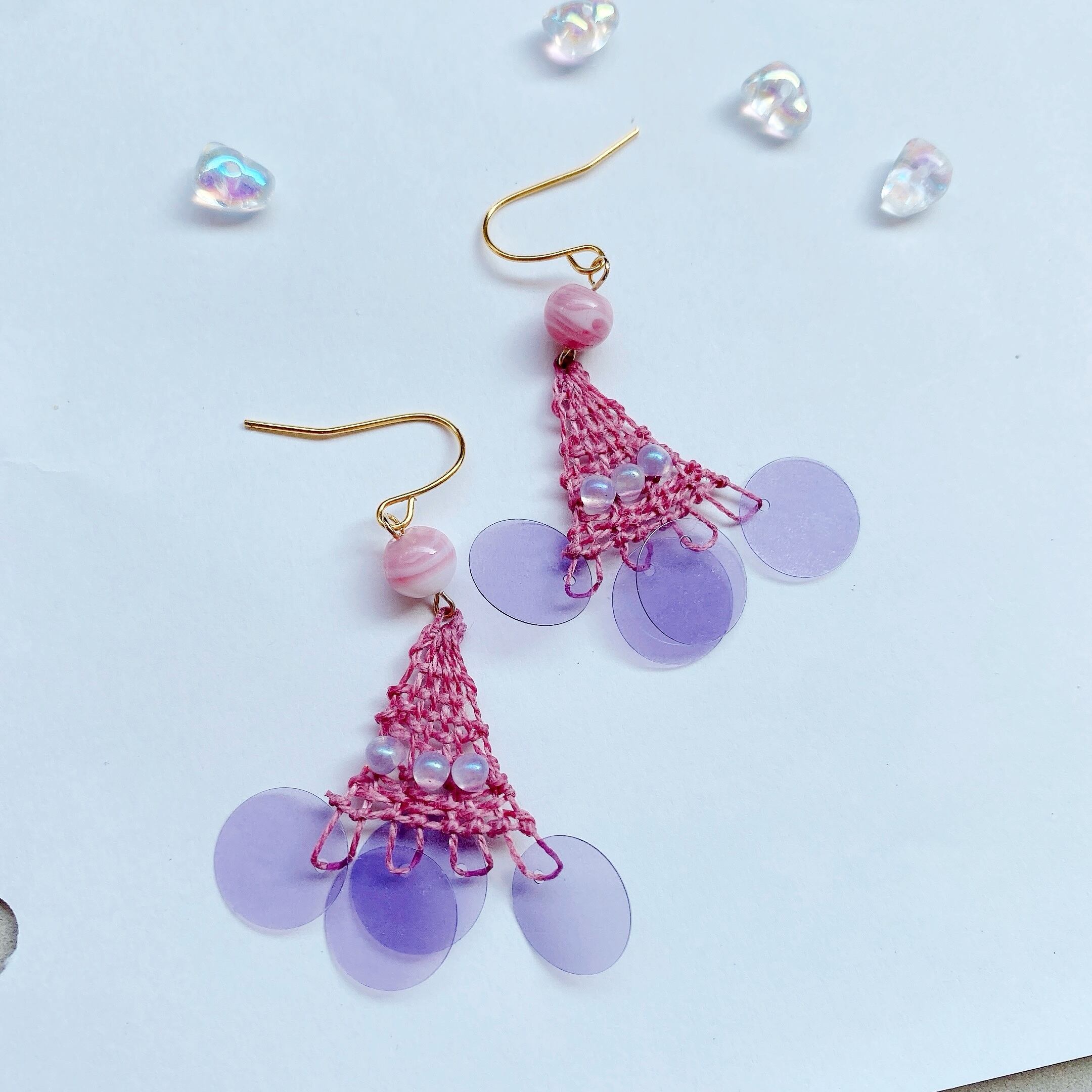 [材料]      うすむらさき色糸・スパンコール・ガラスビーズ・ピアス金具