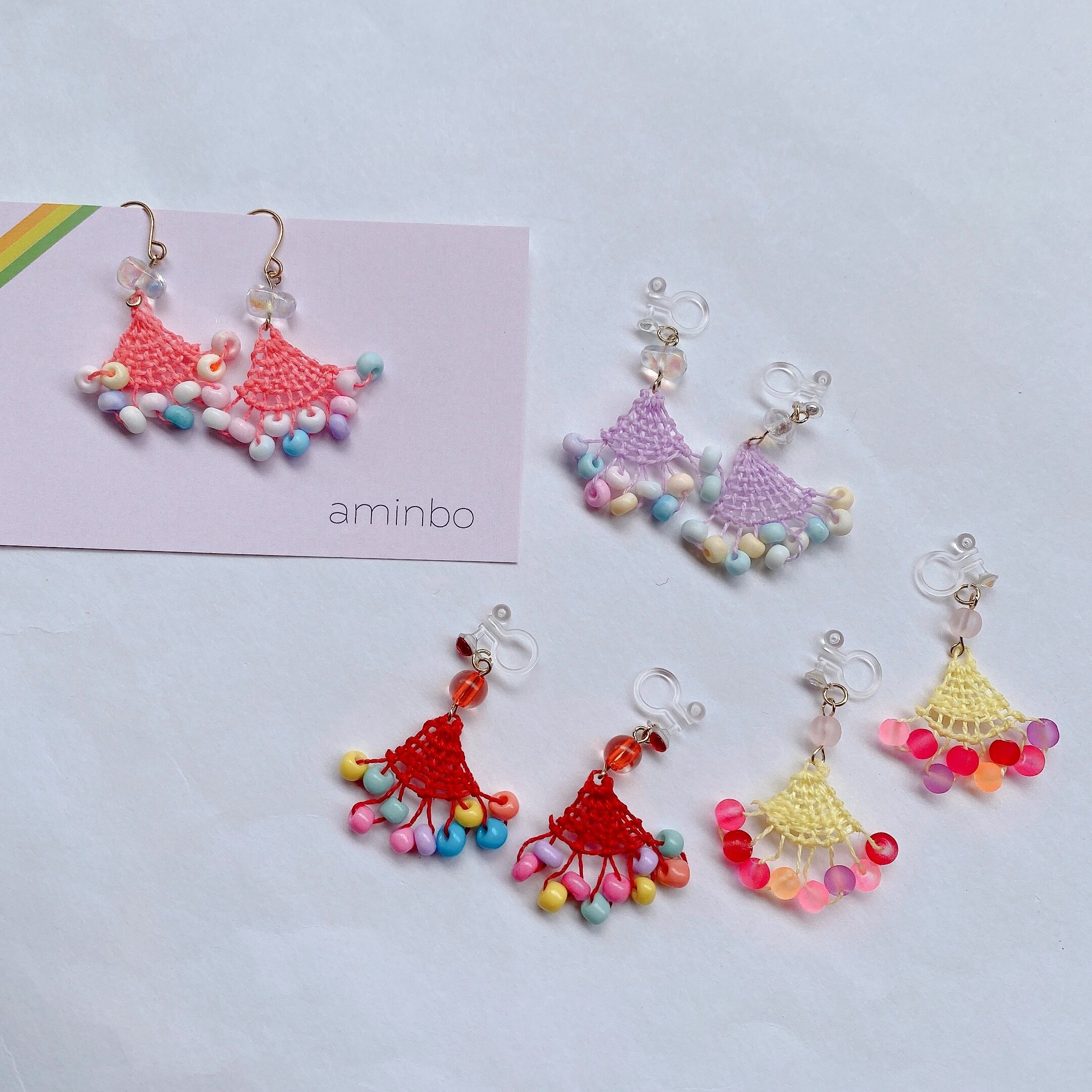 材料:糸(赤・パープル・イエロー・ピンク)・ガラスビーズ・アクリルビーズ・ピアス金具・イヤリング樹脂金具