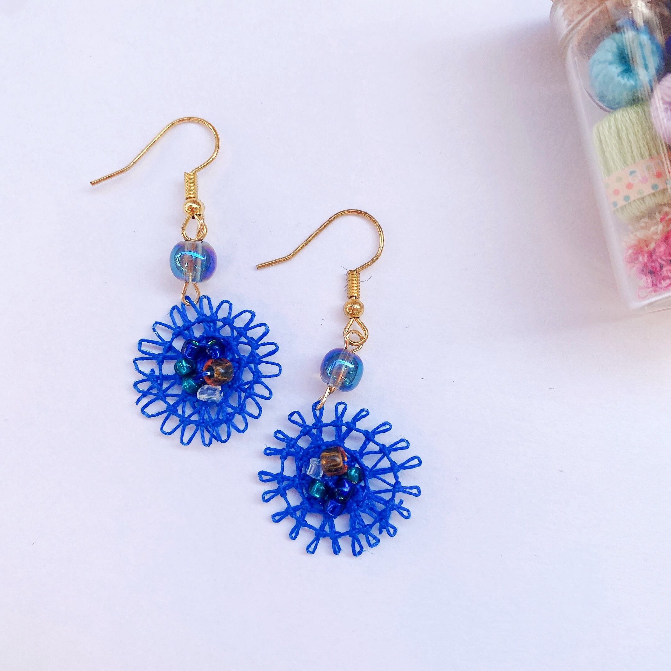 とても綺麗なブルーの色に小さなガラスビーズをたくさんつけました。